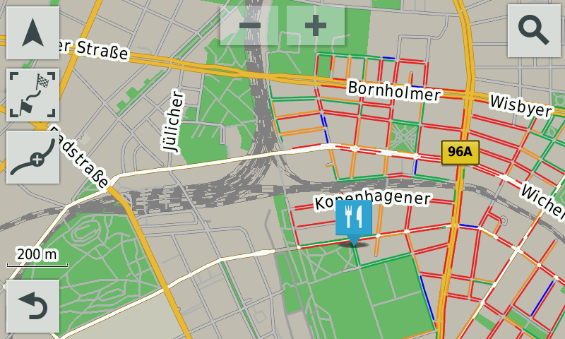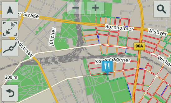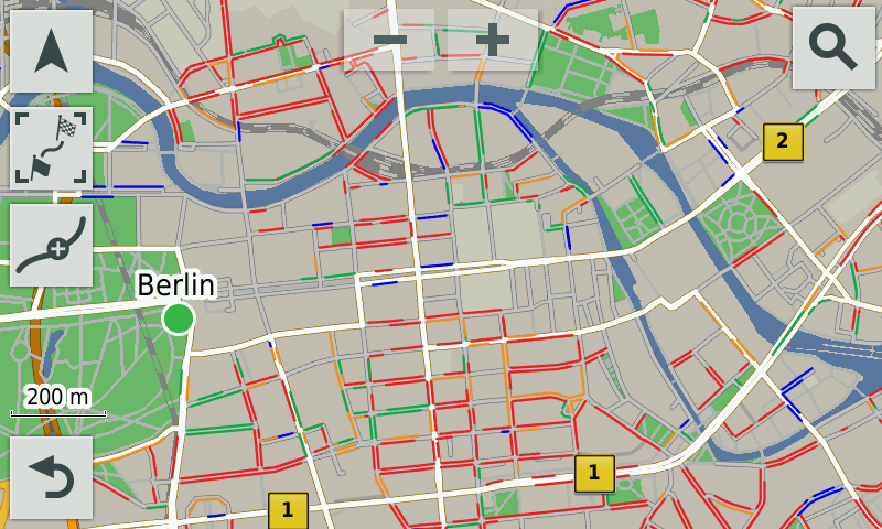 Schon in unserem Top Geräte Navi Test hatten wir beim Garmin nüviCam darauf hingewiesen, dass sich Staus und Umfahrungen zu wenig von anderen Kartenelementen unterscheiden. Auch beim DriveLuxe 51 bleibt es weiterhin schwer, einen guten Überblick anhand der Karte zu gewinnen. Insgesamt konnte uns der Verkehrsservice vom Garmin DriveLuxe 51 nicht recht überzeugen. Viele Meldungen auf der Autobahn waren eher informativ, als dass sie tatsächliche Alternativen bereithielten. Durch die Fülle an weiteren Hinweisen, wie Wildwechsel, Kurven usw., sollten die Meldungen auf wirklich relevante Informationen beschränkt bleiben. Zusätzlich wurden selbst über längere Zeit bestehende Baustellen, auf gut befahrenen Landstraßen, in unserer Umgebung nicht angezeigt. Solche gravierenden Einschränkungen sollten bei einem Live-Traffic-Dienst nicht vorkommen. Mustergültig hingegen funktioniert die Darstellung der Echtzeit-Verkehrssituation in Städten wie Berlin.