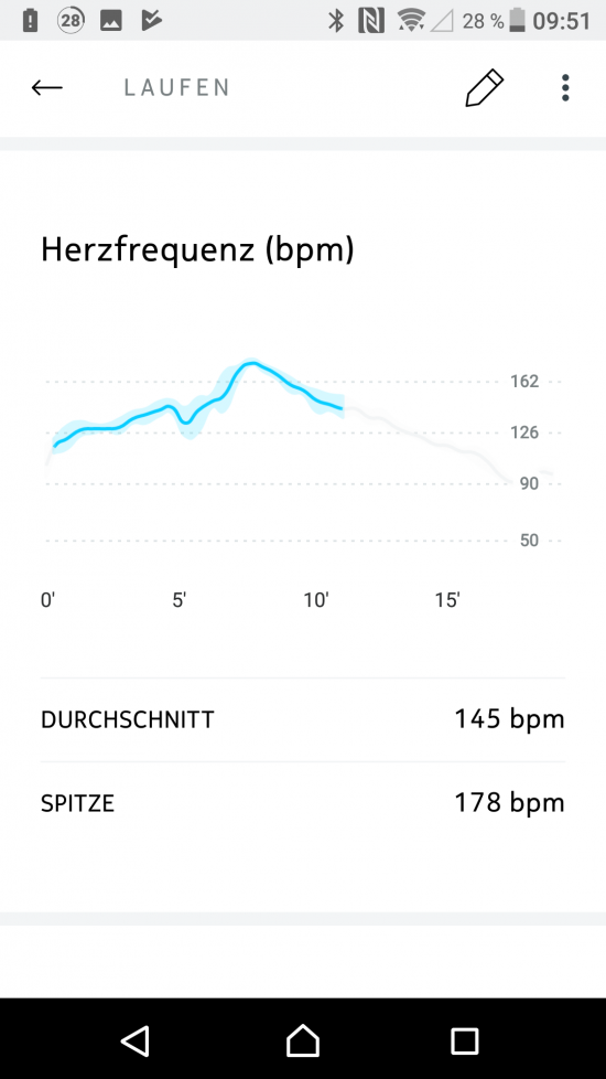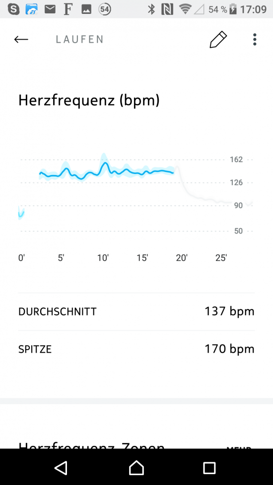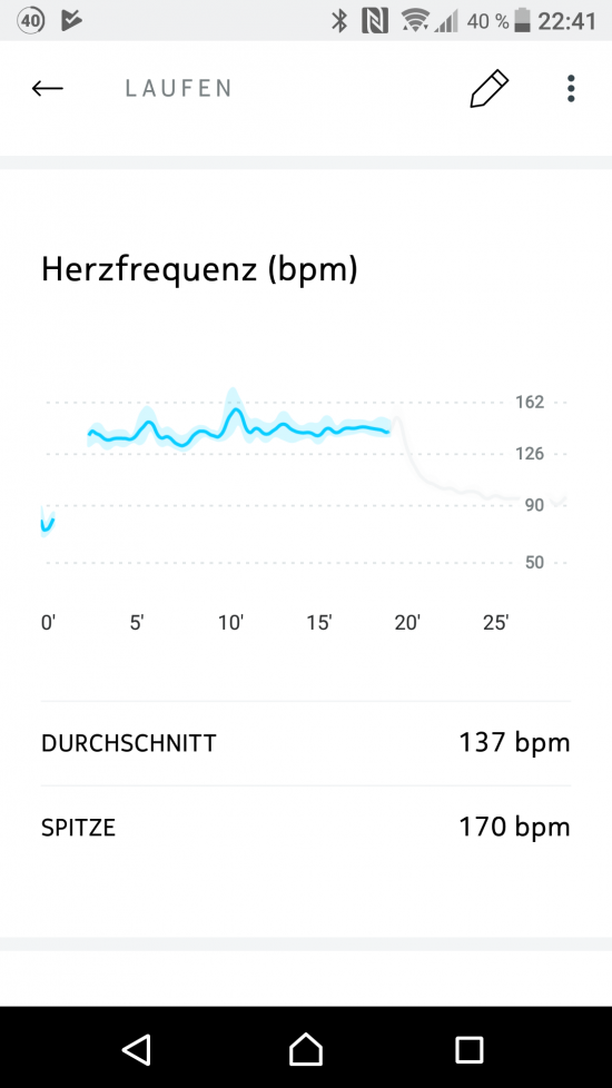 Leider bietet Nokia keine Möglichkeit, Herzfrequenzdaten zu exportieren, was die Auswertung der Daten sowie die Beurteilung von Qualität und Zuverlässigkeit wesentlich erschwert. Innerhalb der Nokia Health App gibt es die Möglichkeit, die Herzfrequenz einer Trainingseinheit in einem kleinen und wenig aussagekräftigen Diagramm anzuzeigen. Sehr schwach für ein Feature welches sogar im Produktnamen prominent beworben wird.