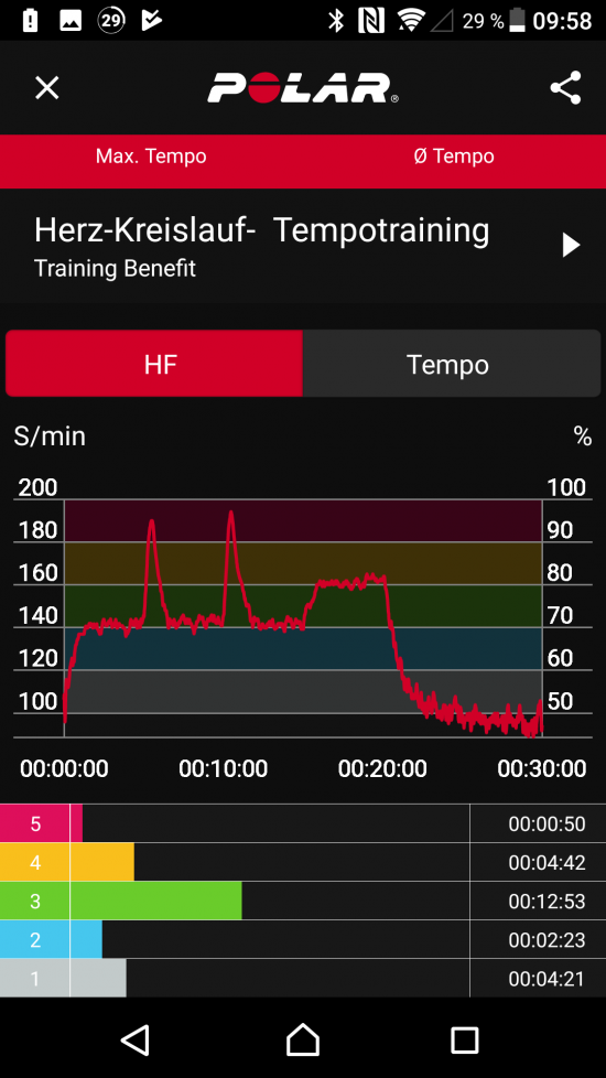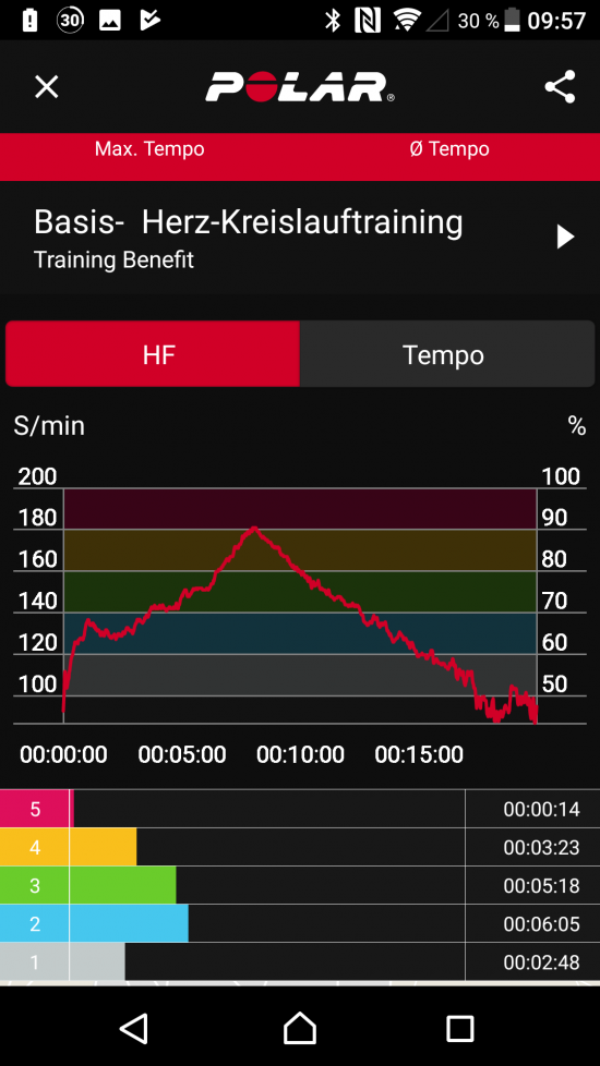 Das nachfolgende Training ist von einem langsamen Anstieg der Intensität geprägt. Die maximale Herzfrequenz der Polar Brustgurtmessung beträgt 181 Schläge pro Minute. Durch den langsamen Anstieg bleibt der Nokia Steel HR genug Zeit zur Messung, daher liegt die Spitze mit 178 Schlägen pro Minute nur unwesentlich unter der Messung des Brustgurtes.