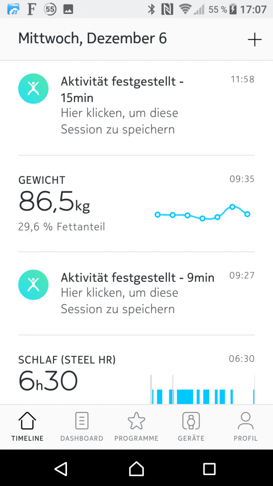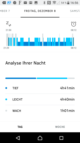 Insgesamt leistet die vollautomatische Schlaferkennung der Nokia Steel HR gute Arbeit. Vereinzelt wurden jedoch ruhige Bettphasen am Abend, die mit Lesen oder Fernsehen verbracht wurden, bereits als Beginn der Schlafphase berechnet. Die Summe der Tiefschlafphasen wurde gegenüber anderen Produkten z.B. der Amazfit Pace deutlich länger beurteilt. Die Schlaferkennung einer Fitnessuhr ersetzt kein Schlaflabor und gibt nur einen groben Anhalt über die Schlafsituation. Das subjektive Schlafgefühl deckt sich oft nicht mit den Auswertungen, was durchaus interessant ist, aber oft auch mehr Fragen als Antworten liefert.