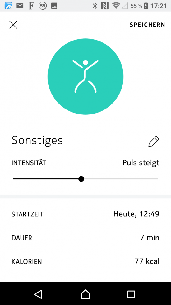 Die aktiv verbrauchten Kalorien werden leider nur über die App angezeigt und werden aus den Bewegungsdaten, der Herzfrequenz sowie der Bewegungsart berechnet. Wird die Bewegungsart nicht automatisch erkannt, wird der Nutzer aufgefordert, die gefühlte Intensität der Aktivität einzuschätzen. Aus dieser Einschätzung ergibt sich dann maßgeblich die Höhe der verbrauchten Kalorien (allerdings nur, wenn die Aktivität automatisch erkannt wurde). Die Einstellung erweckt den Eindruck, dass die Entwickler den Werten der Herzfrequenzmessung bzw. der dazugehörigen Kalorienberechnung wohl selbst noch nicht so ganz vertrauen.