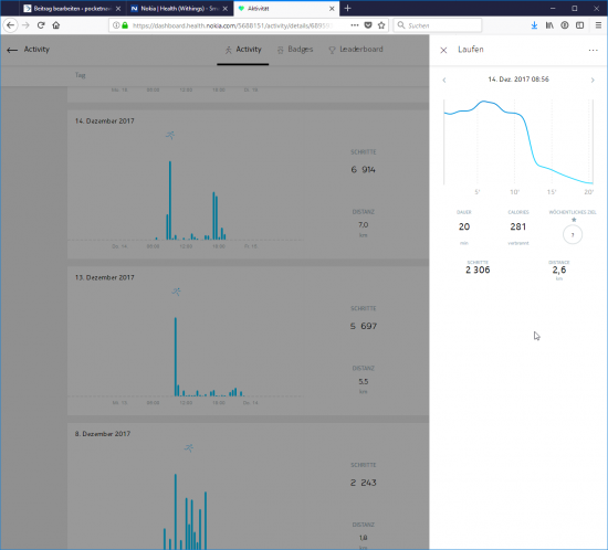 Merkwürdigerweise unterscheiden sich die erkannten und erfassten Aktivitäten zwischen der Nokia Health Mate App und dem Online-Portal health.nokia.com teilweise. Über das Online-Portal werden deutlich mehr erkannte Aktivitäten aufgelistet als in der App angezeigt werden.