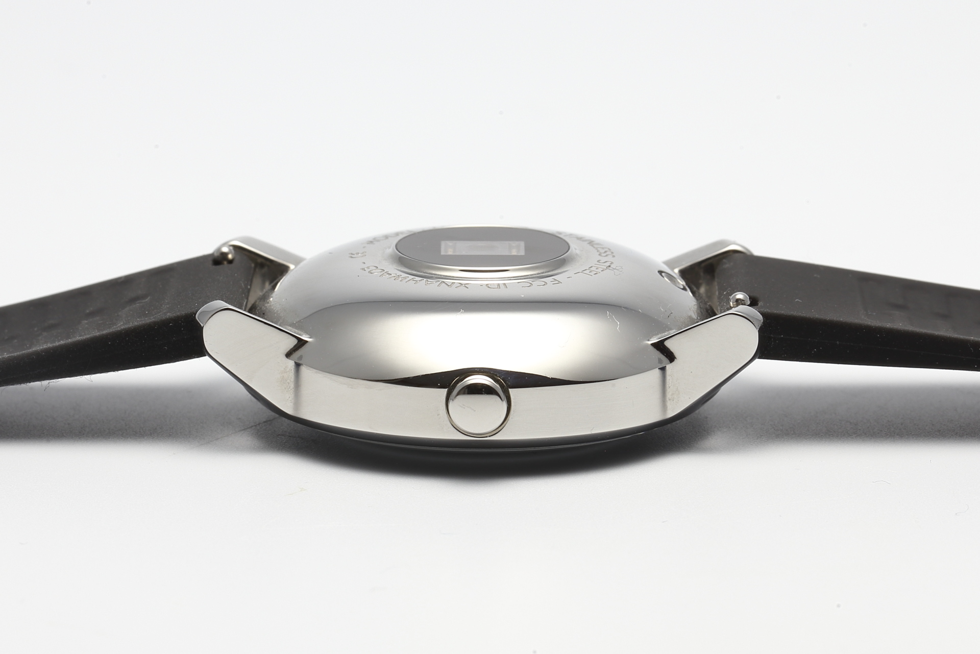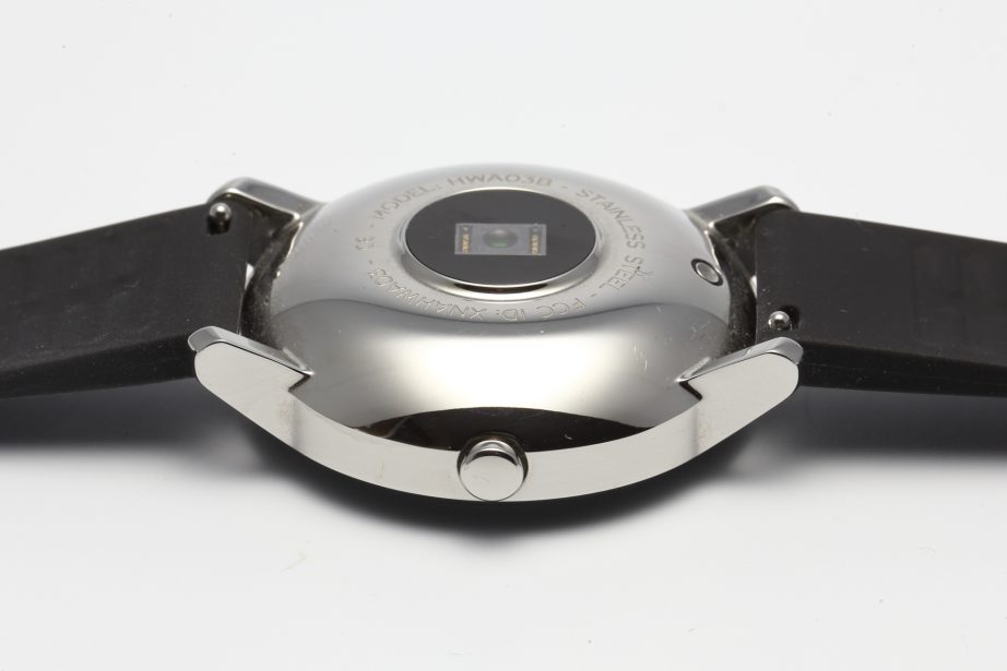 Das Gehäuse besteht aus Metall und ist auf der Rückseite stark abgerundet um dem HR-Sensor eine optimale Auflage und Anpressdruck zu ermöglichen. Was der Messgenauigkeit entgegenkommt, wirkt sich leider etwas negativ auf den Tragekomfort aus. Durch die geringe Auflagefläche muss die Uhr recht fest getragen werden und hinterlässt damit leicht Druckstellen auf der Haut. Für einen Fitnesstracker ist die Uhr selbst in der 36 mm Version mit 43,5 Gramm (inkl. Armband) recht schwer.