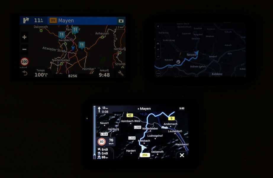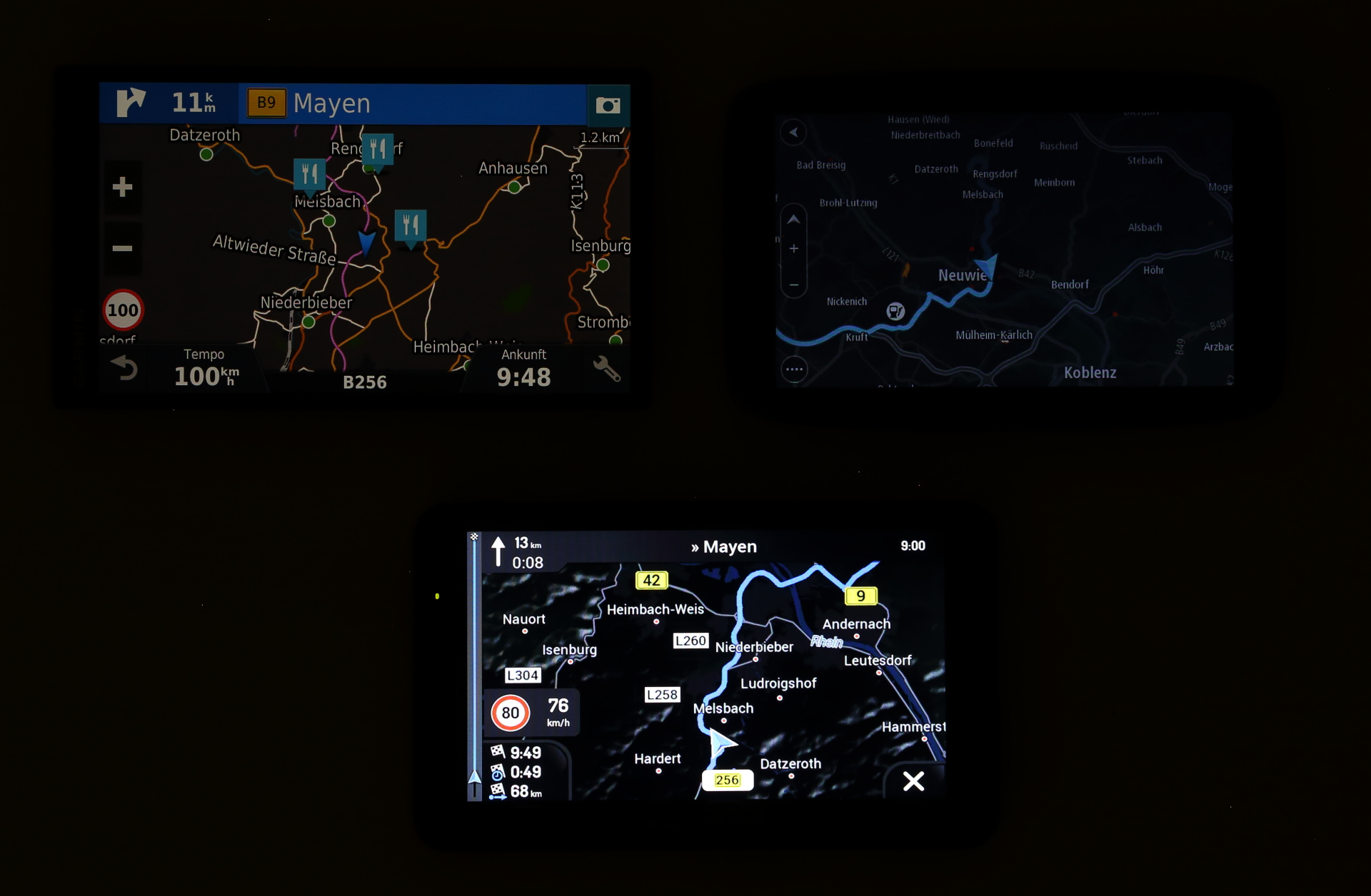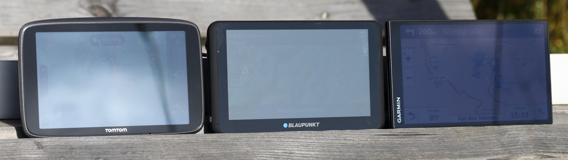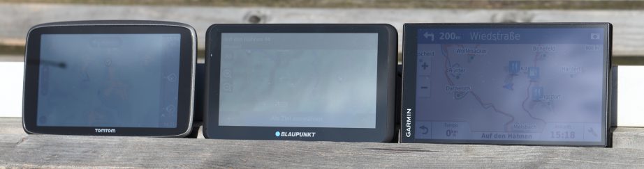 Fotos können die Darstellungsqualität von Displays nur sehr begrenzt darstellen, vor allem wenn mehr als ein Display nebeneinander abgelichtet wird. Minimal Unterschiede im Winkel und in der Beleuchtung können große Unterschiede auf Fotos erzeugen. Mit diesen beiden Bildern aus jeweils anderen Winkeln wird jedoch deutlich, das Garmin hat bezüglich Ablesbarkeit im direkten Sonnenlicht klar die Nase vorne. Danach folgenden mit etwas Abstand das TomTom, dicht gefolgt vom Blaupunkt.
