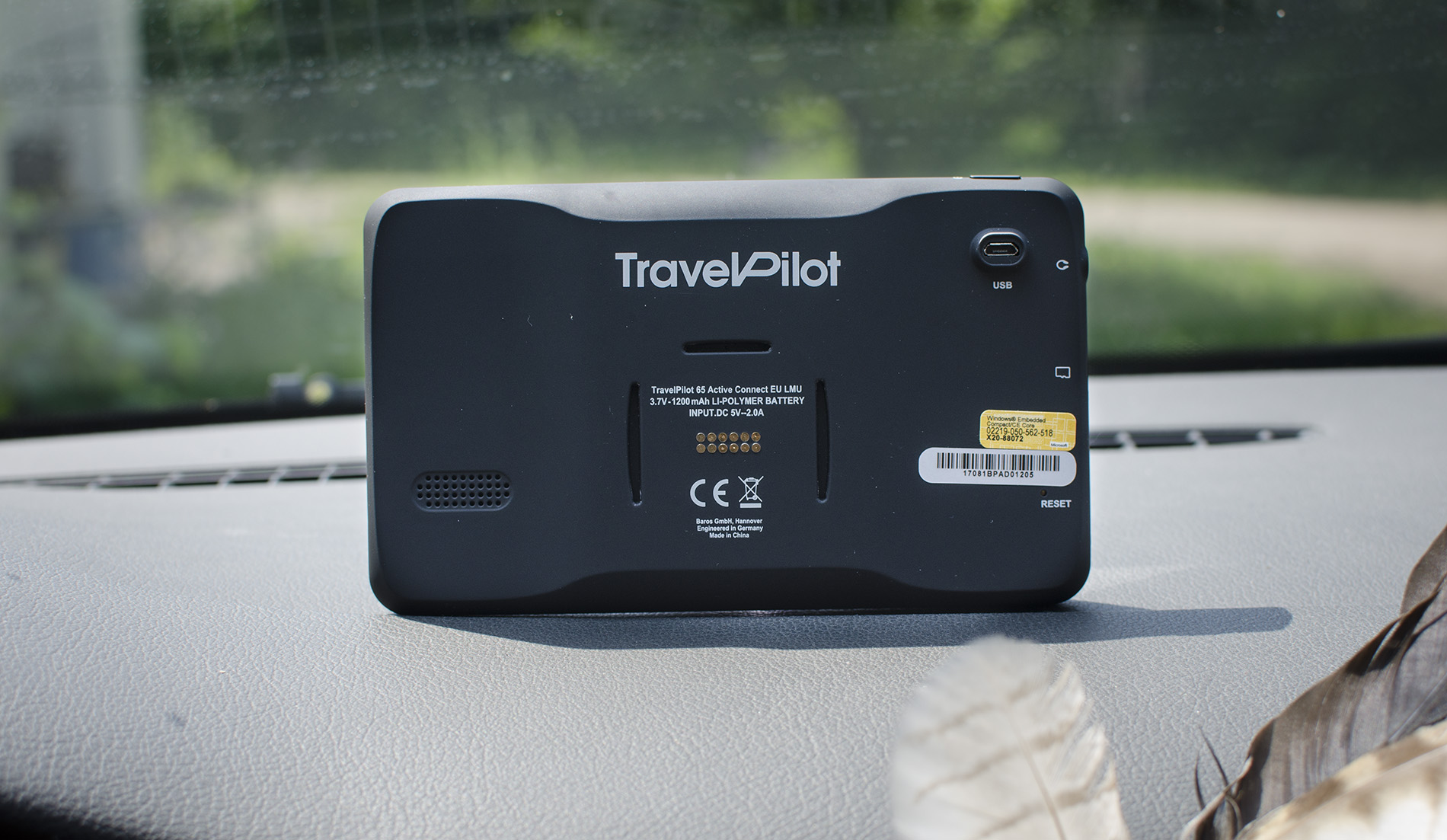 Der TravelPilot 65 Active Connect EU LMU präsentiert sich in einem unauffälligen und schlichten Design. Das Gehäuse besteht komplett aus Kunststoff und wirkt damit nicht herrausragend elegant. Mit Ausnahme des Ein-/Aus-Tasters wird das Gerät komplett über den Touchscreen bedient. Der interne 8GB Speicher bietet noch ca. 1,77 GB freien Speicher für weitere Karte. Zusätzlich kann der Speicher über eine MicroSD-Karte erweitert werden. Als optionaler Audio-Ausgang ist eine 3,5mm Buchse verbaut, welcher zusätzlich auch an der aktiven Halterung zur Verfügung steht.