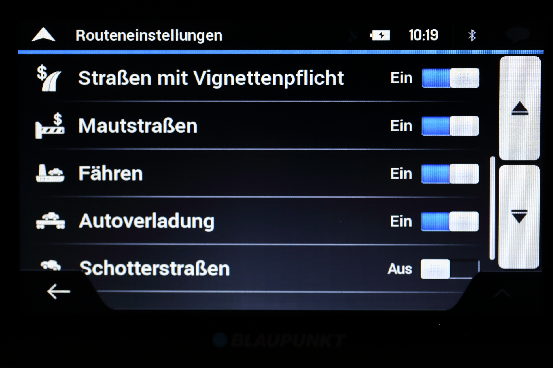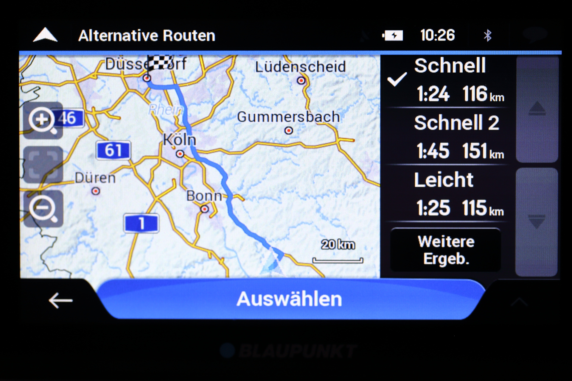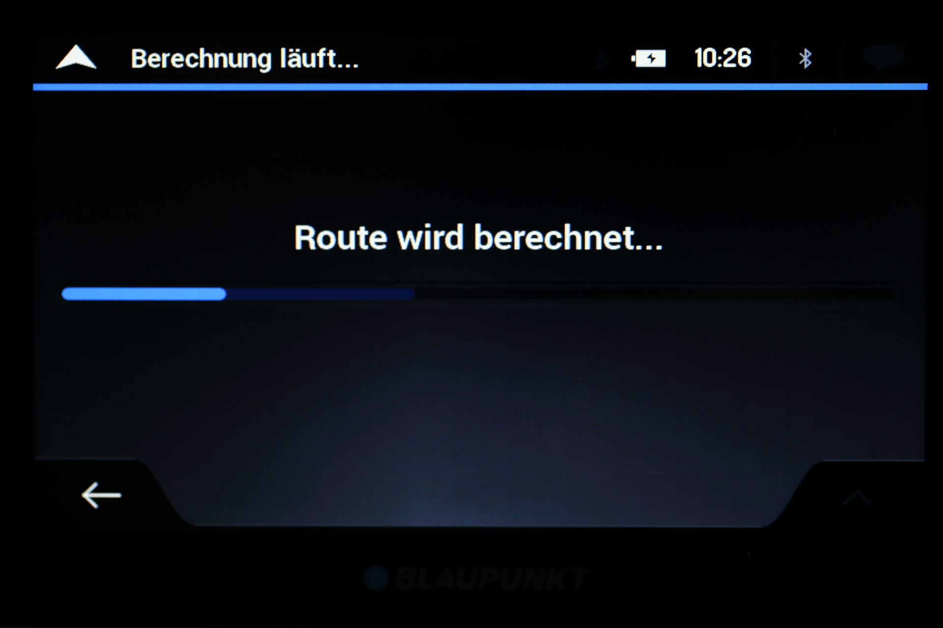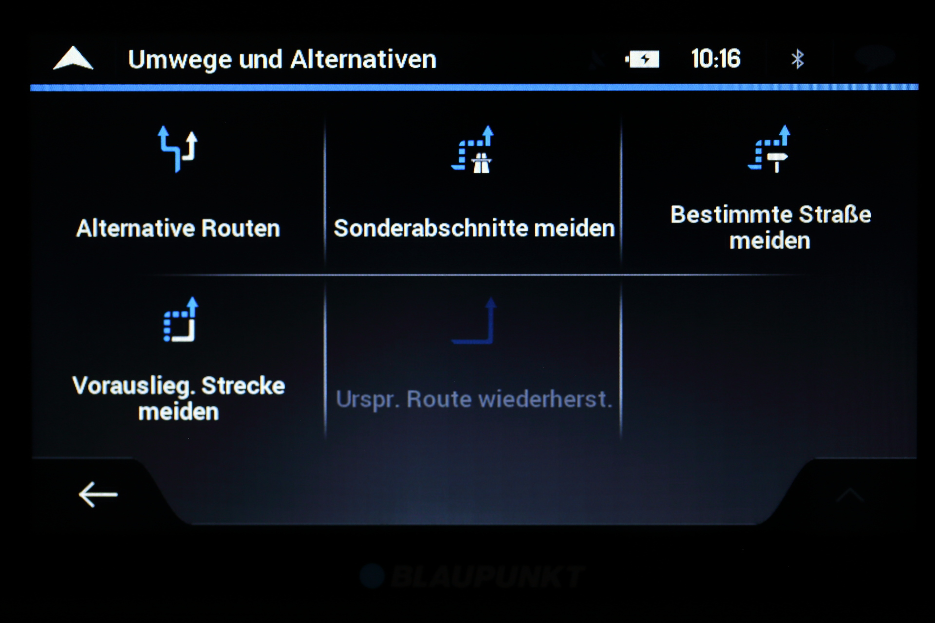 Die Performance des Blaupunkt TravelPilot 65 Active Connect bei der Routenberechnung ist insgesamt recht gut, lässt aber bei der Nutzung von erweiterten Routeneinstellungen deutlich nach. Im Gegensatz zu einigen Garmin Geräten lassen sich aber Routen mit komplexen Optionen zwar langsam, aber immerhin überhaupt berechnen. Ist die Route berechnet können im Fenster „Umwege und Alternativen“ weitere Veränderungen vorgenommen werden.