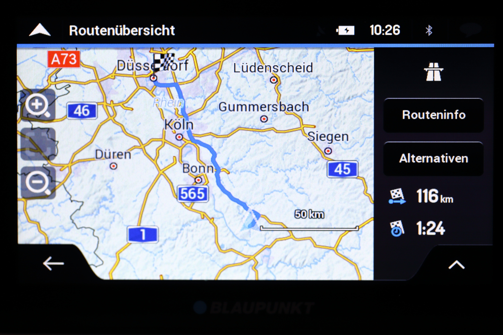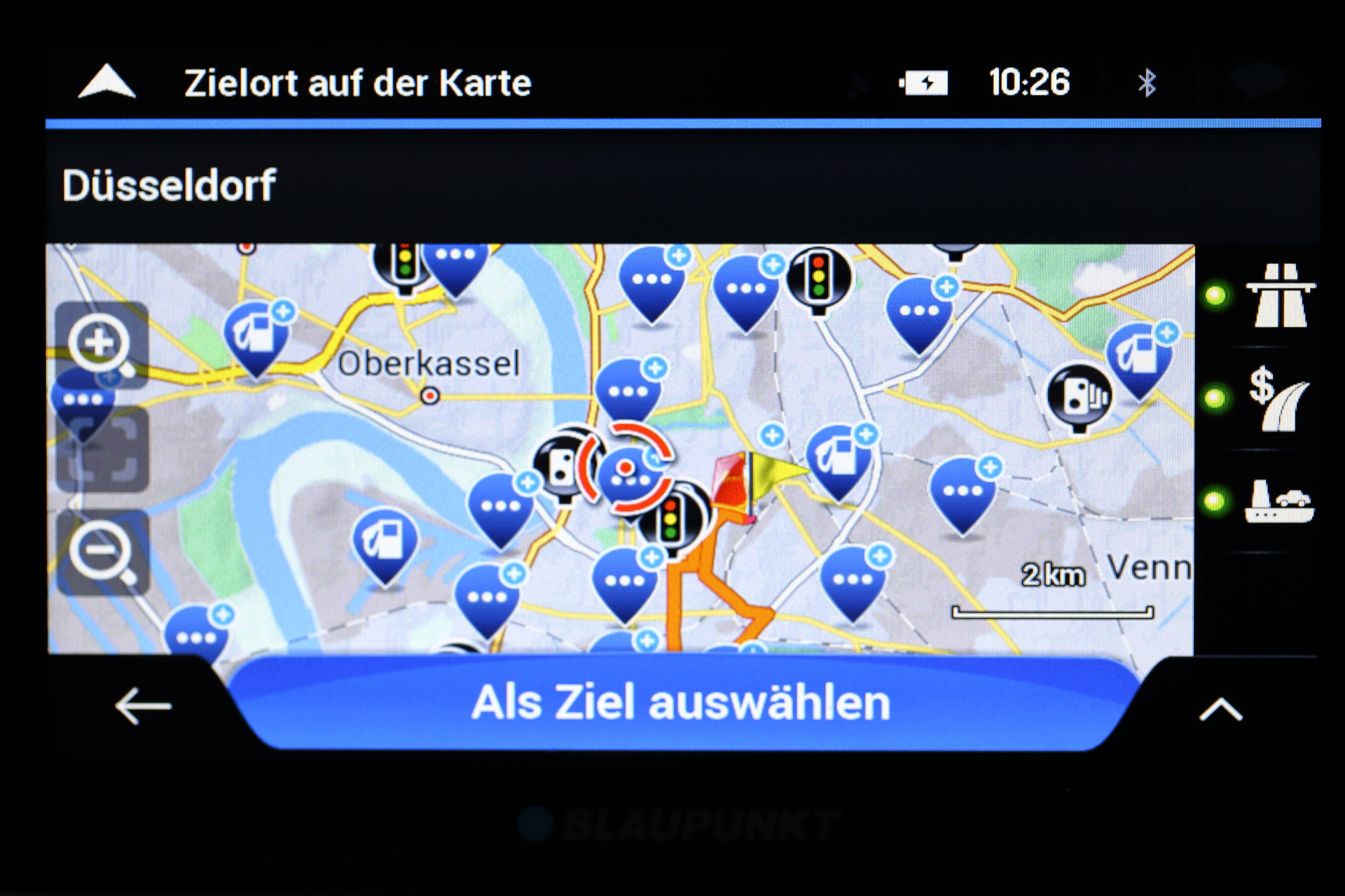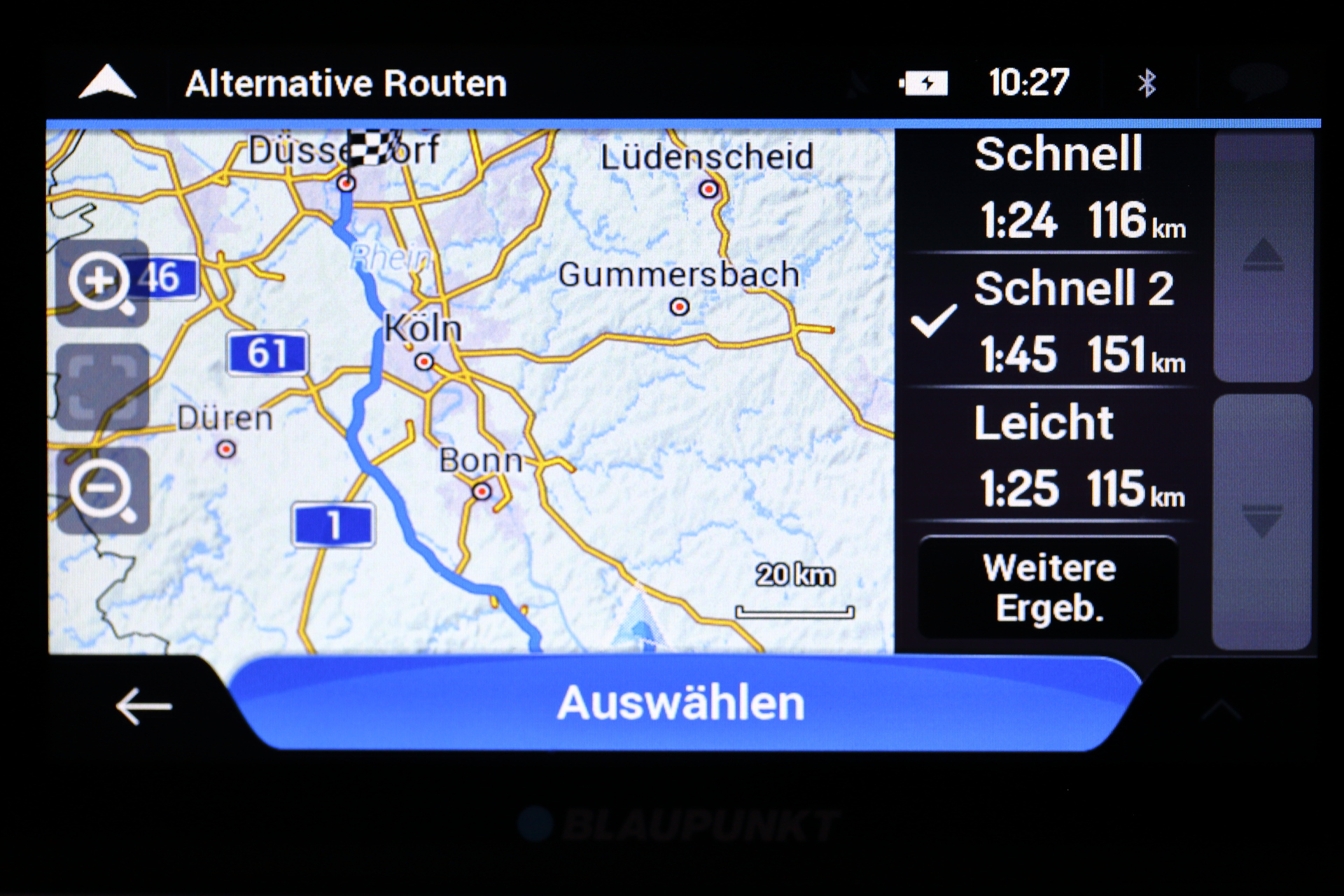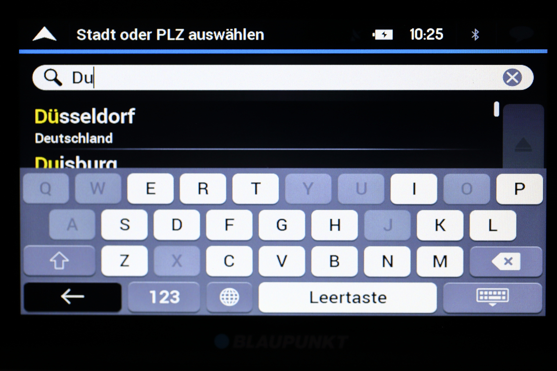 TomTom durchsucht dabei allerdings immer alle möglichen Zielarten wie Straßen, Stadtnamen und POIs. Eine solche Suche über alle Zieltypen ist auch beim Blaupunkt TravelPilot 65 möglich, erfordert allerdings etwas mehr Geduld und die Ergebnisse werden nicht bereits beim Eintippen der Buchstaben in Echtzeit angezeigt. Insgesamt ist die Zieleingabe schnell und zweckmäßig aber nicht besonders innovativ. So haben wir bei einem Gerät welches den Begriff „Connected“ im Namen trägt die Möglichkeit vermisst, Ziele online oder über eine Smartphone App eingeben zu können.