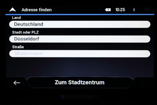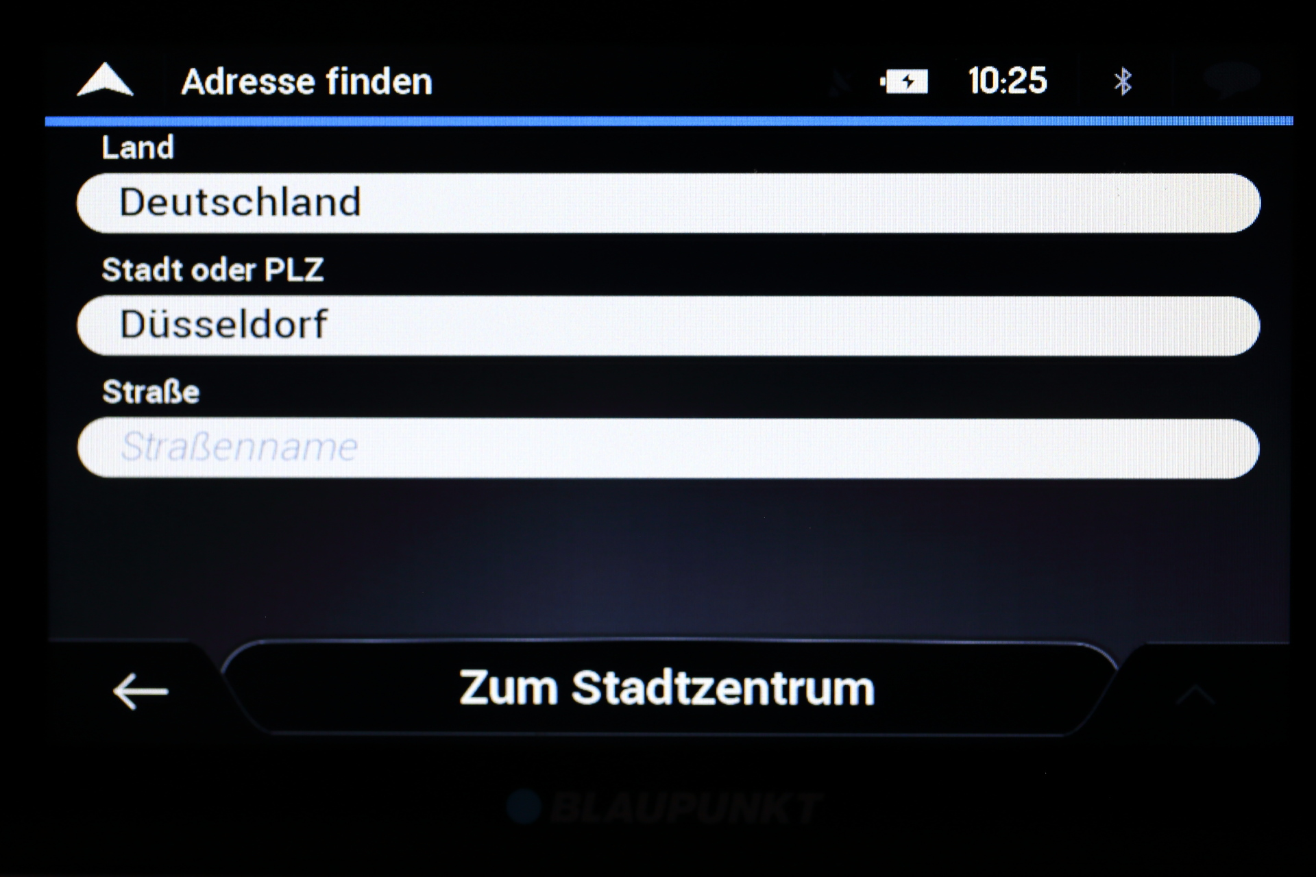 Ziele können im Blaupunkt TravelPilot 65 Active Connect als Adresse, POI, Favoriten, letzte Ziele, aus der Karte oder als Koordinaten eingegeben werden. Die Eingabe erfolgt nach Ort und Straße sowie Hausnummer oder Querstraße getrennt. Nicht mehr mögliche Buchstaben werden automatisch ausgeblendet, was die Eingabe deutlich vereinfacht. Während der Eingabe von Buchstaben wird in Echtzeit bereits nach möglichen Treffern gesucht. Diese Echtzeitsuche erfordert beim Garmin Drive Smart 61 etwas mehr und beim TomTom GO 6200 deutlich mehr Zeit.
