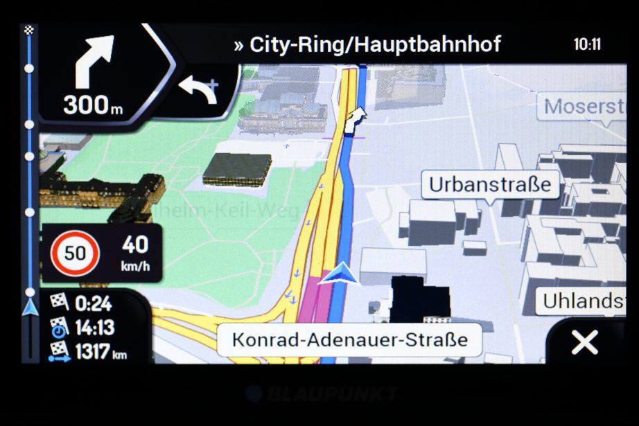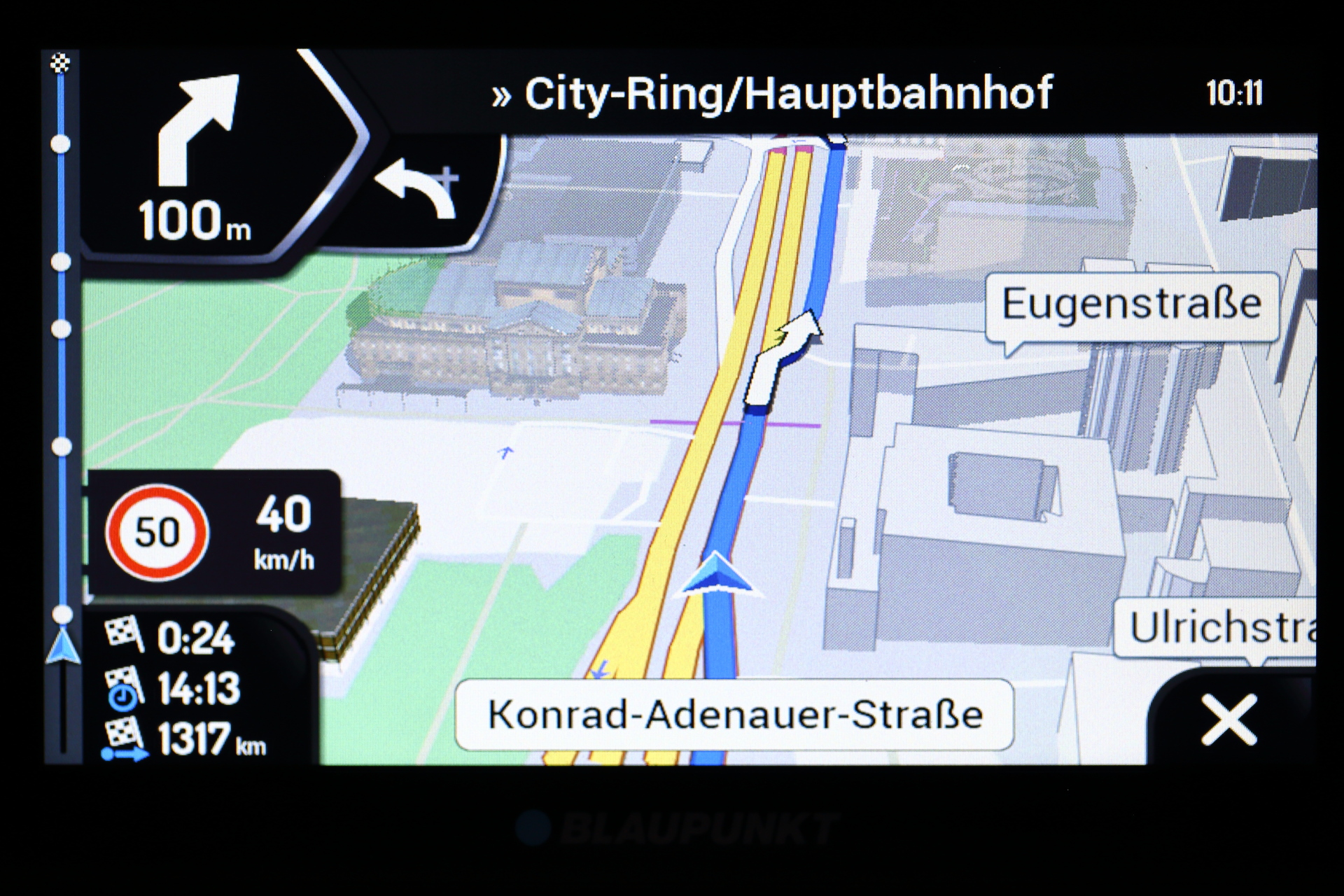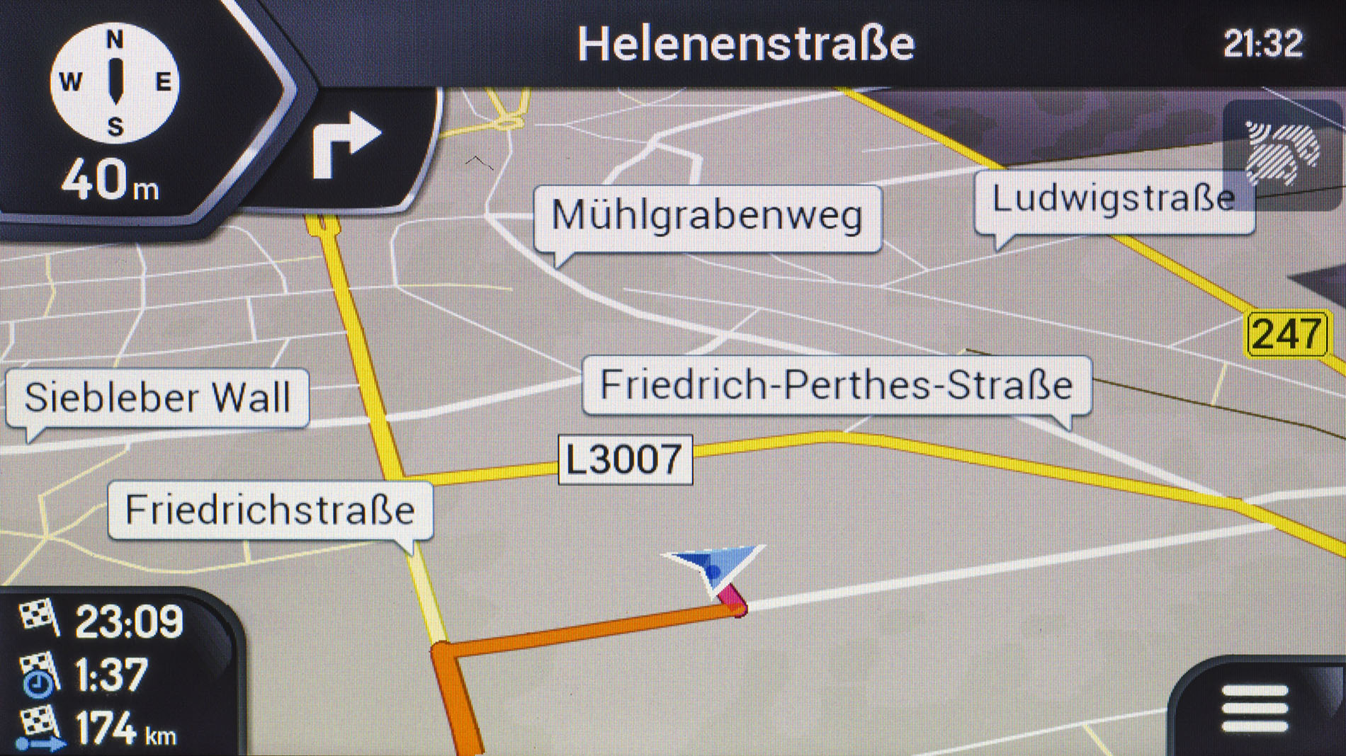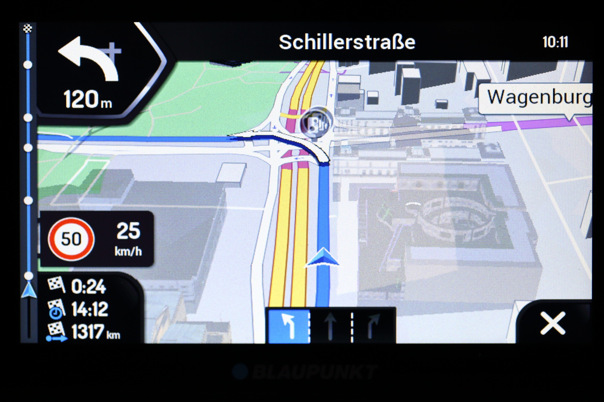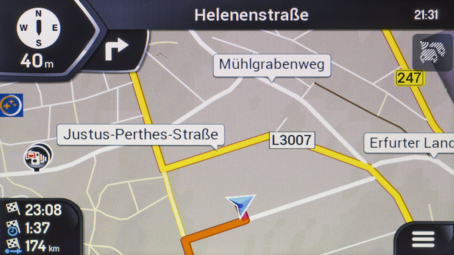 Die visuellen Navigationshilfen empfanden wir in unserem Test als ausreichend um ohne Verwirrung an das Ziel zu gelangen, auch wenn die Grafiken nicht an die realitätsnahen Abbildungen (Garmin) oder den unmissverständlichen aktiven Fahrspurassistenten (Garmin / TomTom) der Konkurrenz herankommen. Das Zusammenspiel der Navigationshilfen mit dem Abbiegepfeil in der oberen linken Ecke ist lobenswert und könnte auch für Motorradfahrer durchaus interessant sein.