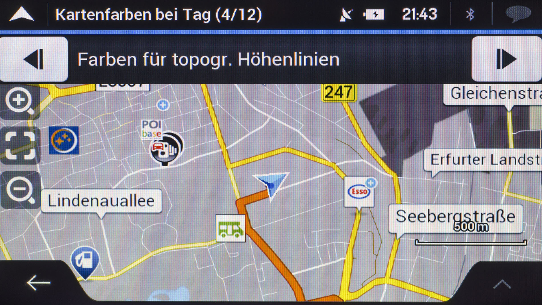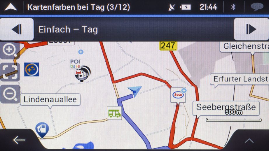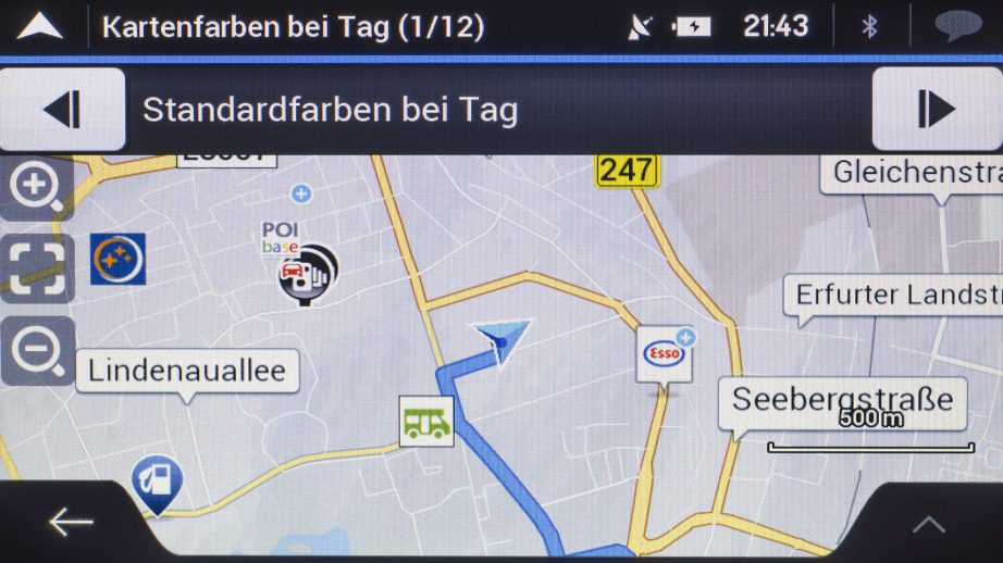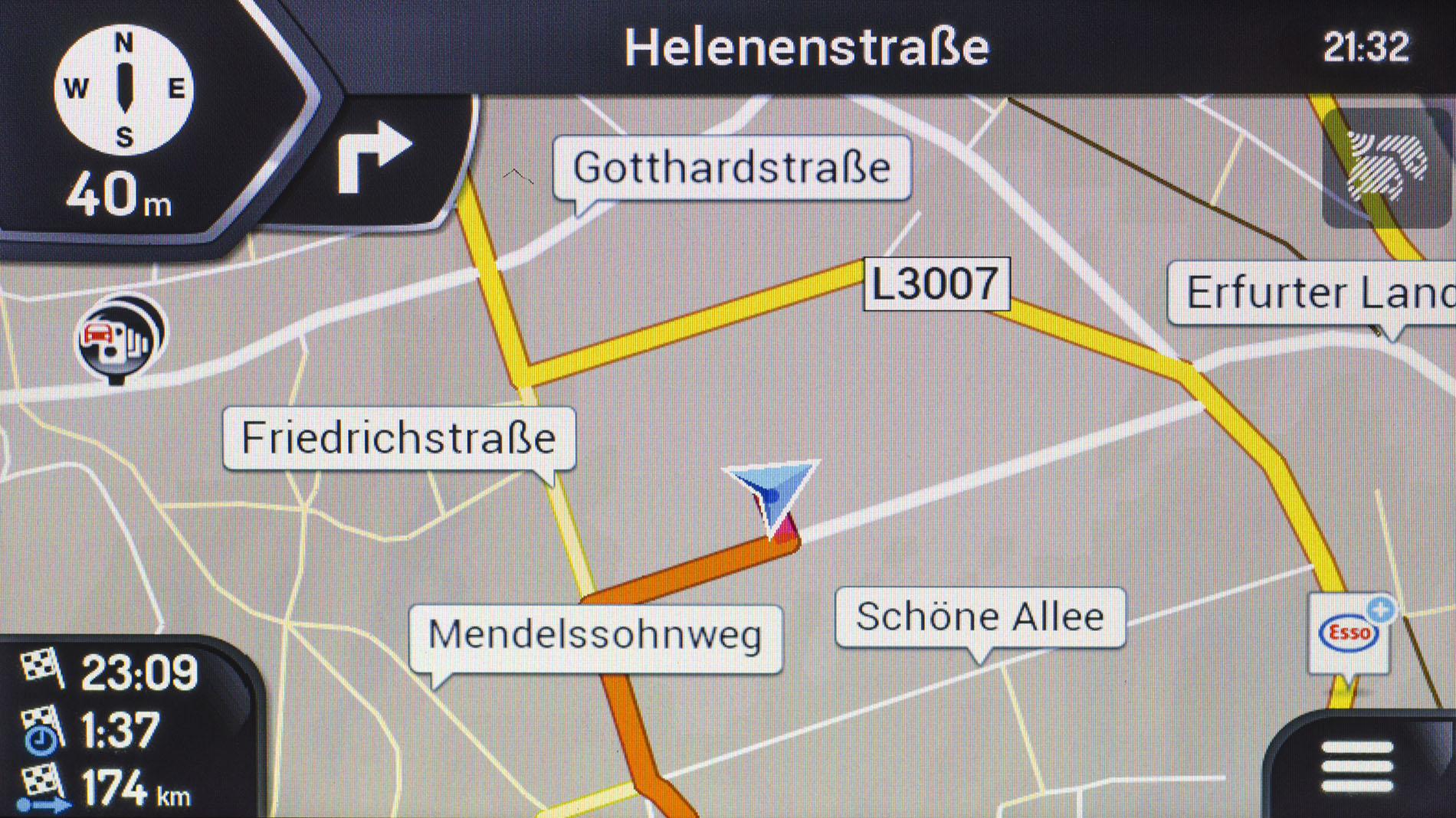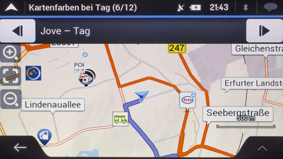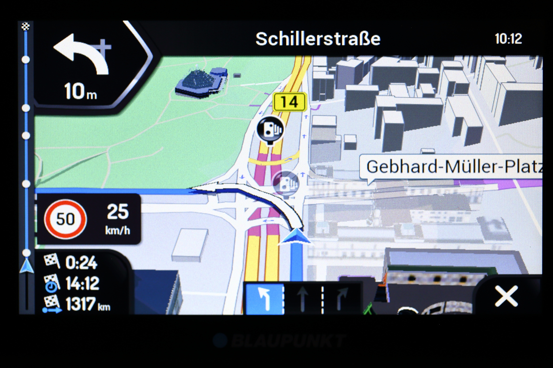 Die visuellen Navigationshilfen empfanden wir in unserem Test als ausreichend um ohne Verwirrung an das Ziel zu gelangen, auch wenn die Grafiken nicht an die realitätsnahen Abbildungen (Garmin) oder den unmissverständlichen aktiven Fahrspurassistenten (Garmin / TomTom) der Konkurrenz herankommen. Das Zusammenspiel der Navigationshilfen mit dem Abbiegepfeil in der oberen linken Ecke ist lobenswert und könnte auch für Motorradfahrer durchaus interessant sein.