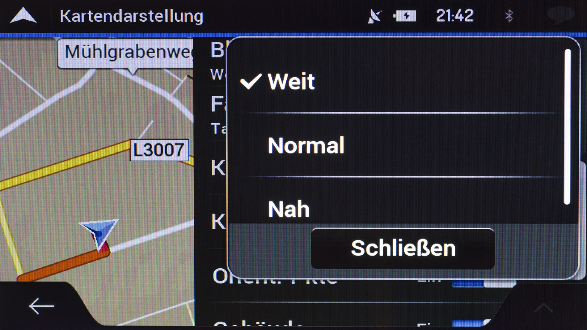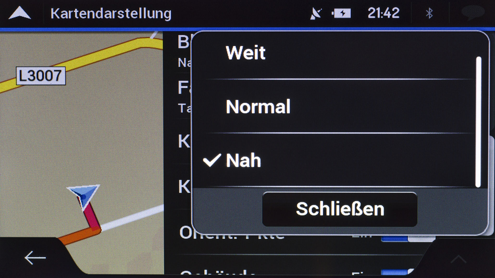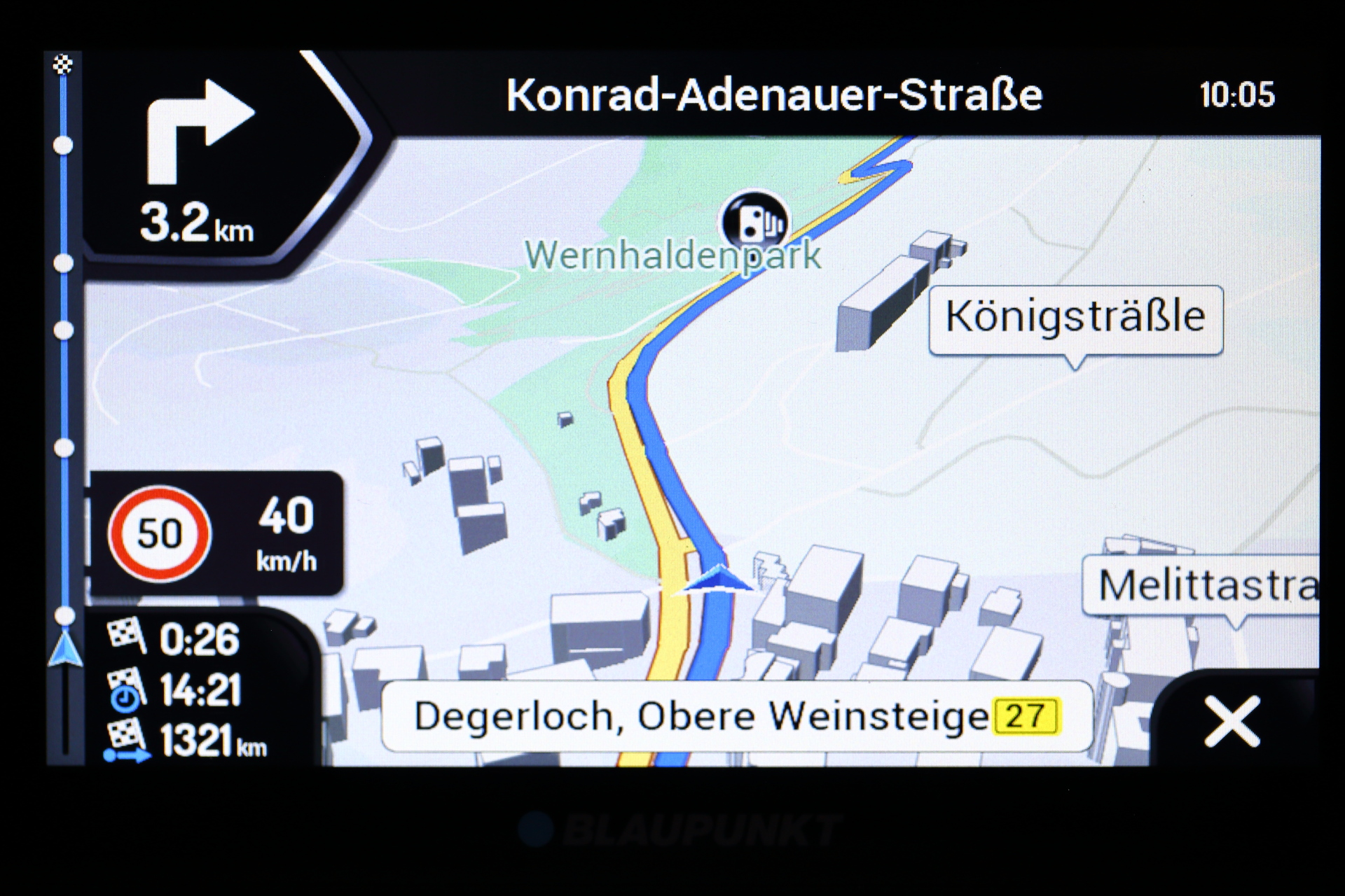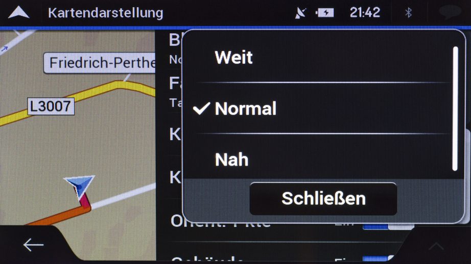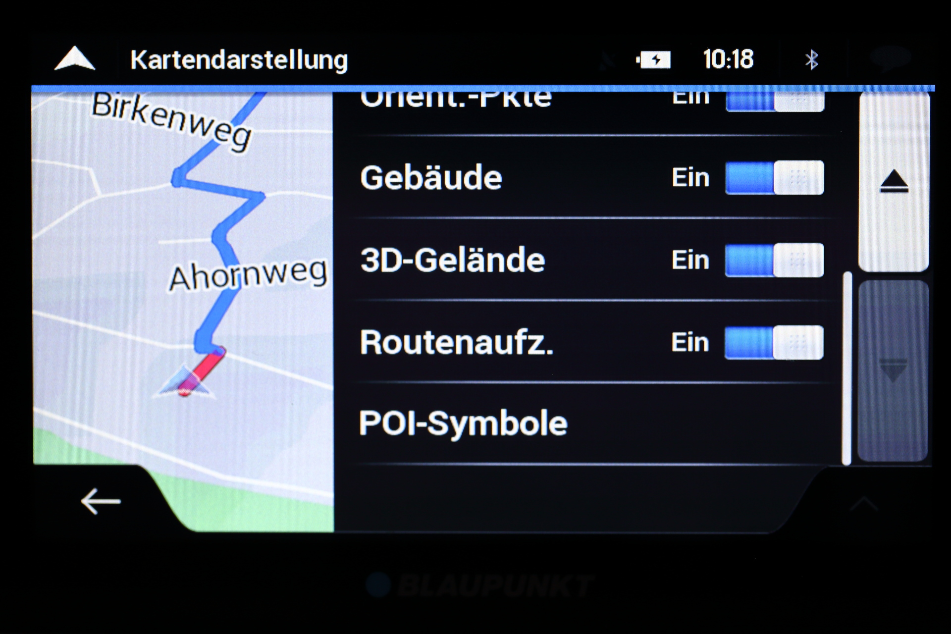 Je nach Geschmack kann der Autozoom des Kartenausschnitts zwischen weit, normal und nah unter der Option „Blickwinkel“ verändert werden. Gerade in Stausituationen kann man so gut den Überblick zur kommenden Reiseroute behalten. Blaupunkt hat hier im Gegensatz zu vorhergehenden Geräten nachgebessert und bietet Fahrern hierdurch eine erstklassige Möglichkeit individuelle Darstellungswünsche umzusetzen.