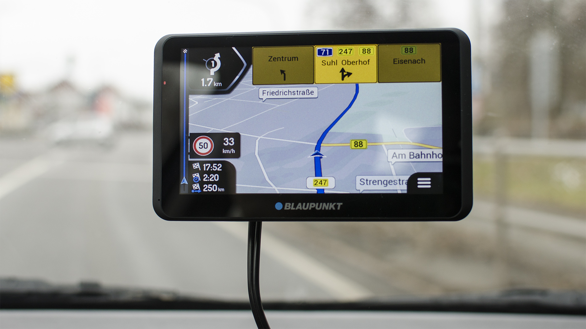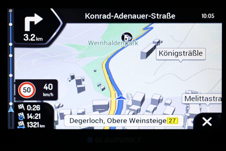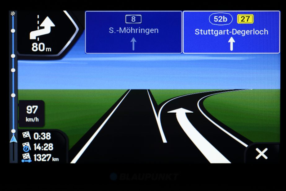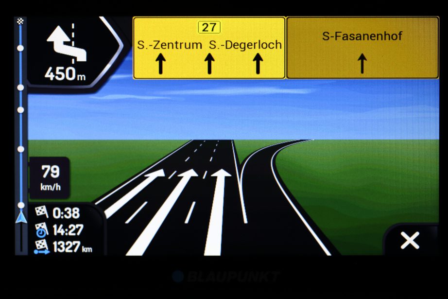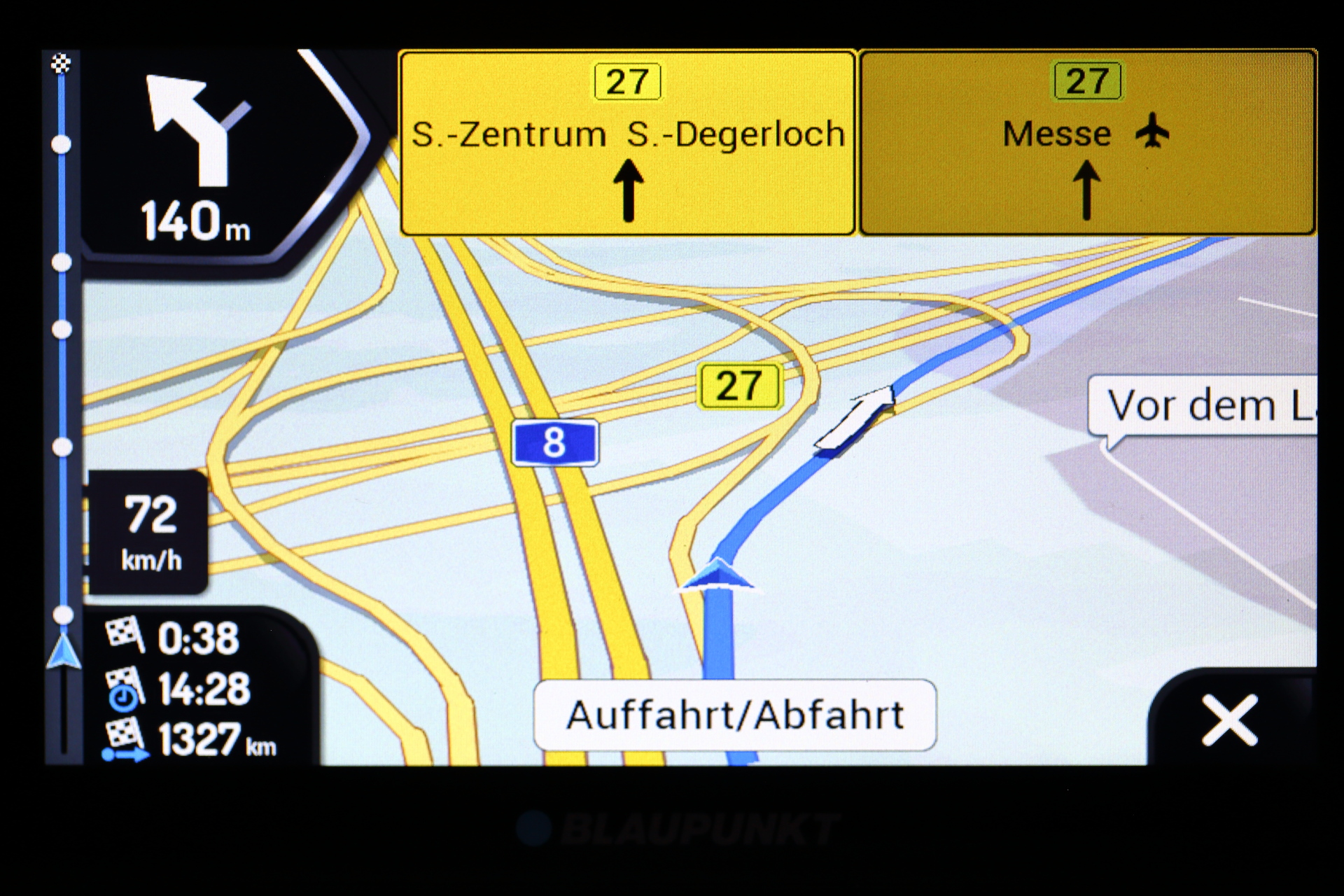 Die inhaltliche Qualität der Sprachausgabe konnte uns nicht in allen Situationen überzeugen. Wir haben mit vielen Einstellungen getestet, konnten dem Navi aber nur selten Sprachausgaben mit Orts- oder Straßennahmen entlocken. Gerade bei komplizierten Autobahnkreuzungen ist aber eine ortsgebundene Richtungsangabe z.B. „A5 Richtung Frankfurt“ sehr wertvoll und wird von den meisten Navis mittlerweile auch beherrscht. Auch Autobahnausfahrten werden nicht mit Namen, sondern nur mit einer Nummer angesagt. Die Ansage von sog. Natural Guidance Hinweisen (z.B. „an der großen Kirche rechts abbiegen“ oder „nach der Tankstelle links abbiegen„) beherrscht das Blaupunkt TravelPilot 65 Active Connected nicht.
