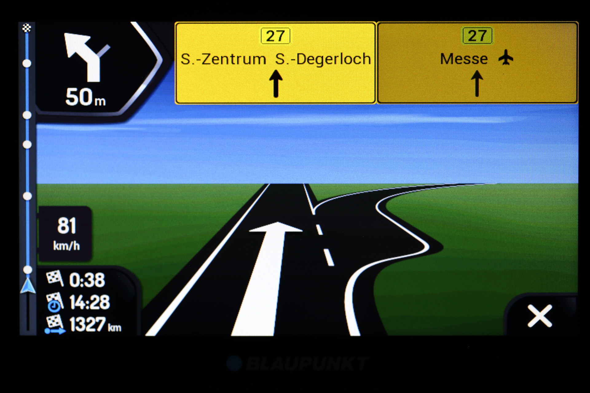 Die unteren vier Abbildungen zeigen die Navigation von der A8 Richtung Pforzheim auf die B27 in Richtung Stuttgart-Degerloch. Generell funktioniert die Navigation über die eingeblendeten Hilfen tadellos. Dennoch würden sich der Fahrspurassistent + die Autobahnschilder (siehe Abb. 1) mit der Kartenansicht (siehe Abb. 2) in einem Splitscreen gegenseitig ergänzen. Im Gegensatz zu Garmins Navis fehlt auch die aktive Darstellung des Fahrspurassistenten wodurch die Grafik stillsteht.