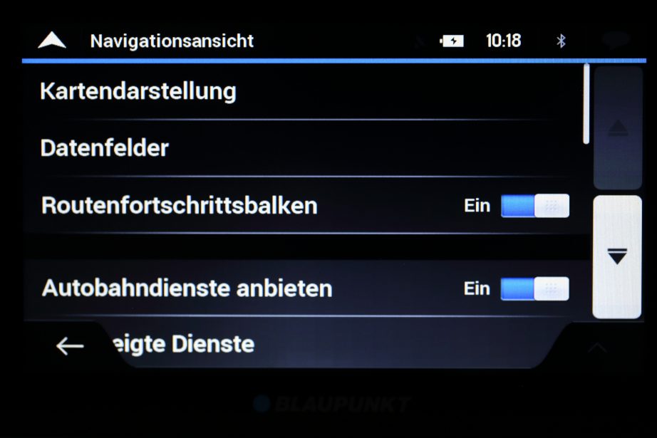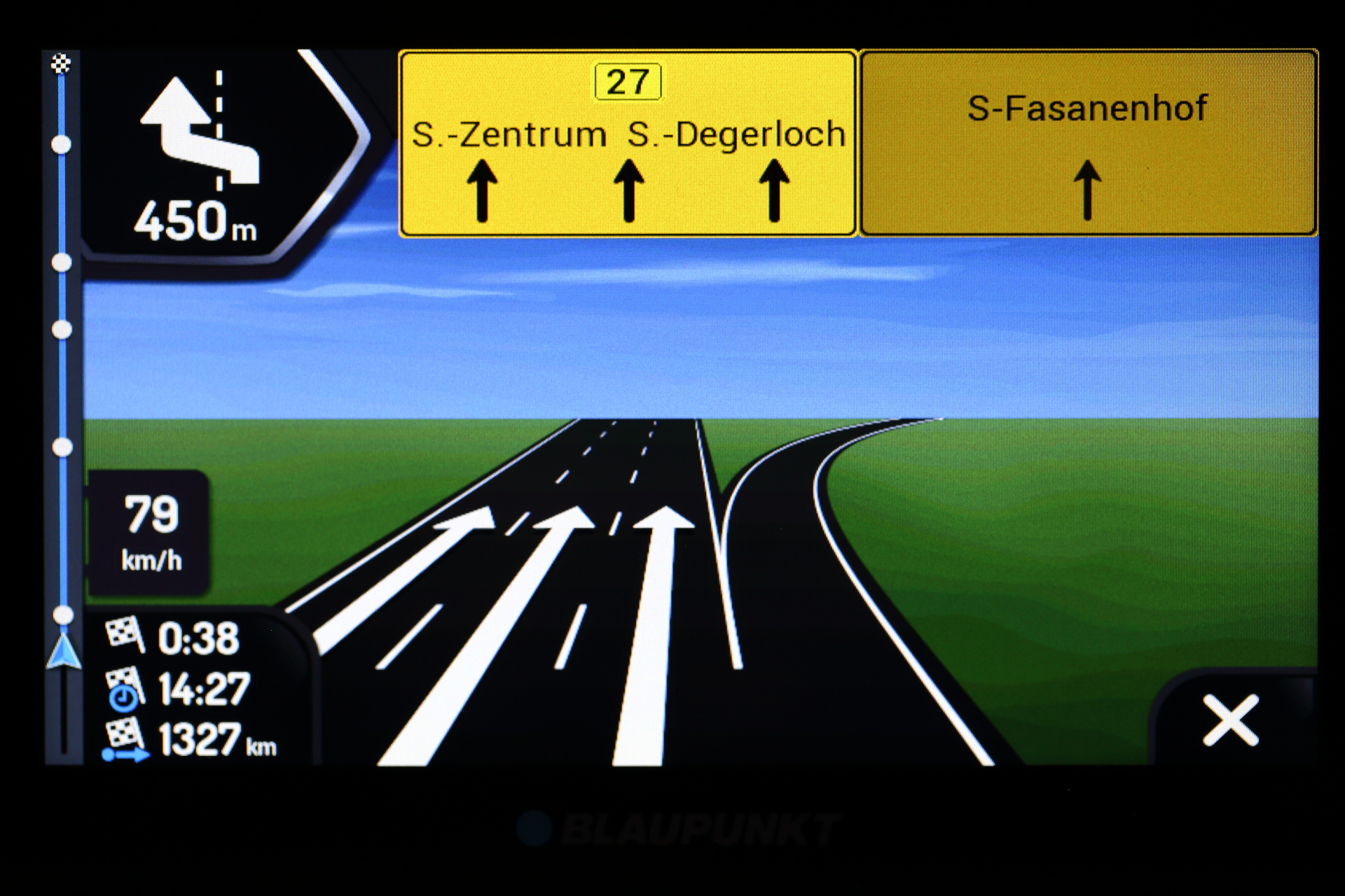 Wie man es von TomToms Navigationsgeräten kennt, besitzt auch das Blaupunkt TravelPilot 65 einen Routenfortschrittsbalken. Er zeigt knapp und prägnant die verbleibende länge der zu fahrenden Strecke und wird ergänzt durch Markierungen von Aktionspunkten sowie Staus und anderen Behinderungen. Der Balken fällt so schmal aus, das er kaum Platz wegnimmt. Dennoch lässt er sich deaktivieren. Für Fernfahrer können neben den typischen Autobahndiensten „Tankstelle“, „Restaurant“, „Rastplatz“ und „Kfz-Dienstleistung“ noch viele weitere eingeblendet werden.