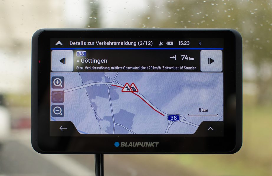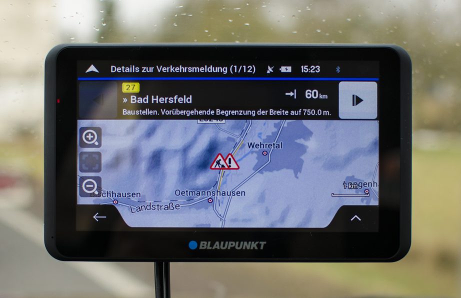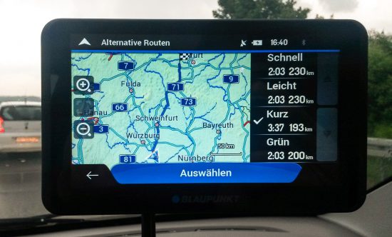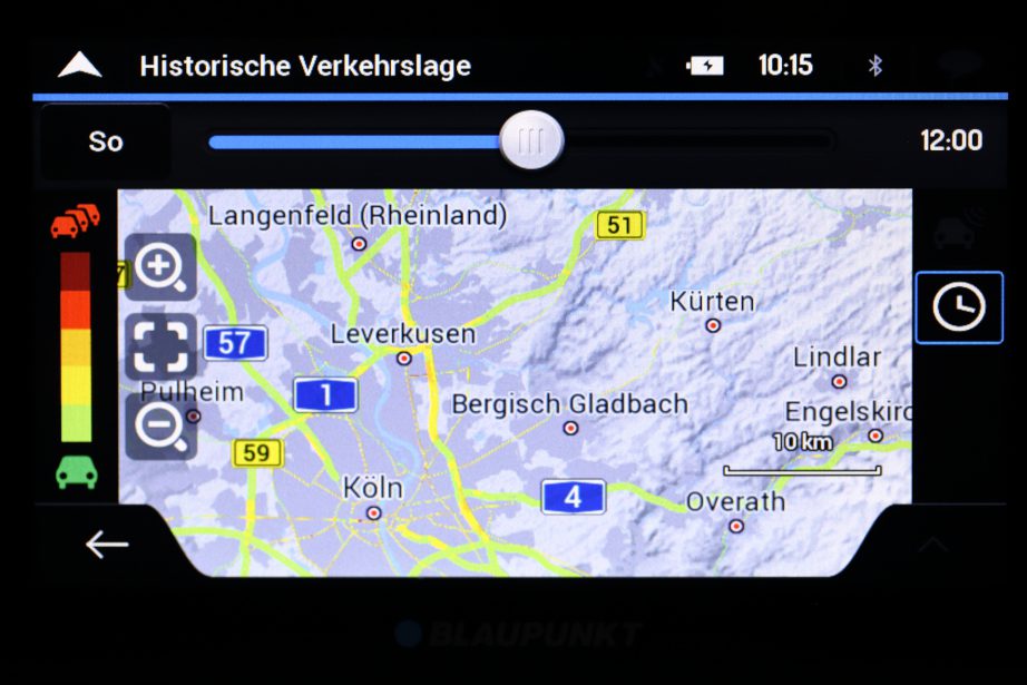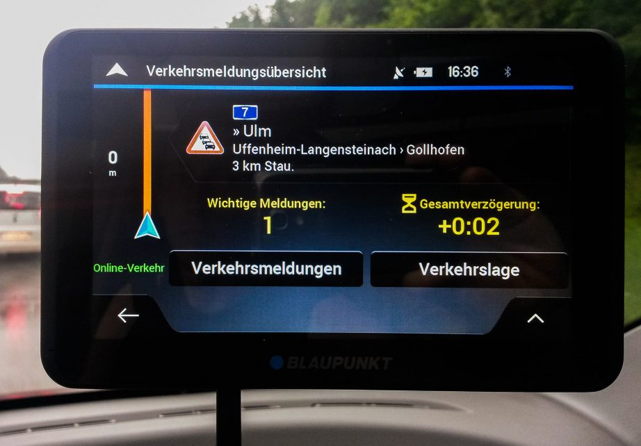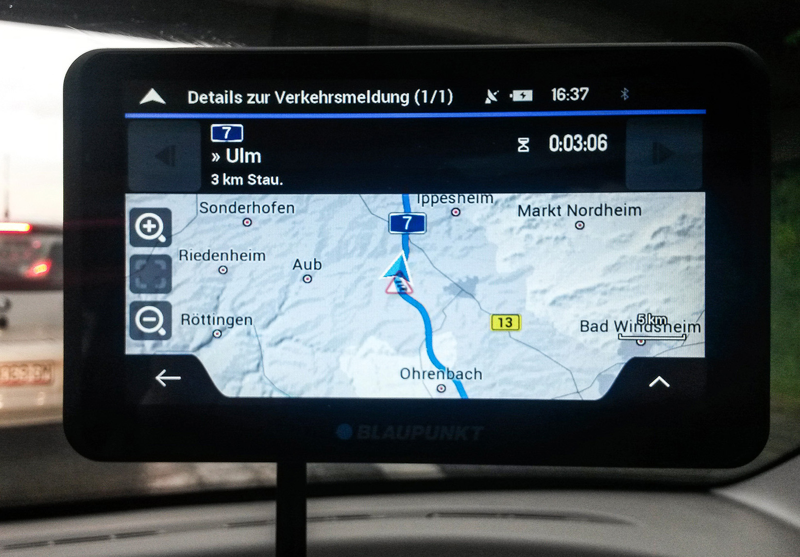 Damit die Online-Verkehrslage funktioniert, muss das Smartphone zunächst mit dem Blaupunkt Navi in den Bluetooth-Einstellungen gekoppelt werden. Das ganze sollte vor Fahrtantritt geschehen, da es nicht automatisch funktioniert und einige Tastendrücke erforderlich sind. In unserem Test hatten wir auf den ersten Fahrten deutliche Schwierigkeiten die Online-Verkehrsdaten via Bluetooth zu empfangen. Zwar war das Smartphone laut den Einstellungen erfolgreich gekoppelt worden, doch die aktuellen Verkehrsbehinderungen auf unserer Route wurden nicht beachtet. Die Daten schienen daher nur TMC-basiert zu sein. Nach einigem Probieren gelang es uns schlussendlich doch die Online-Verkehrsdaten auf dem Navi zu empfangen.