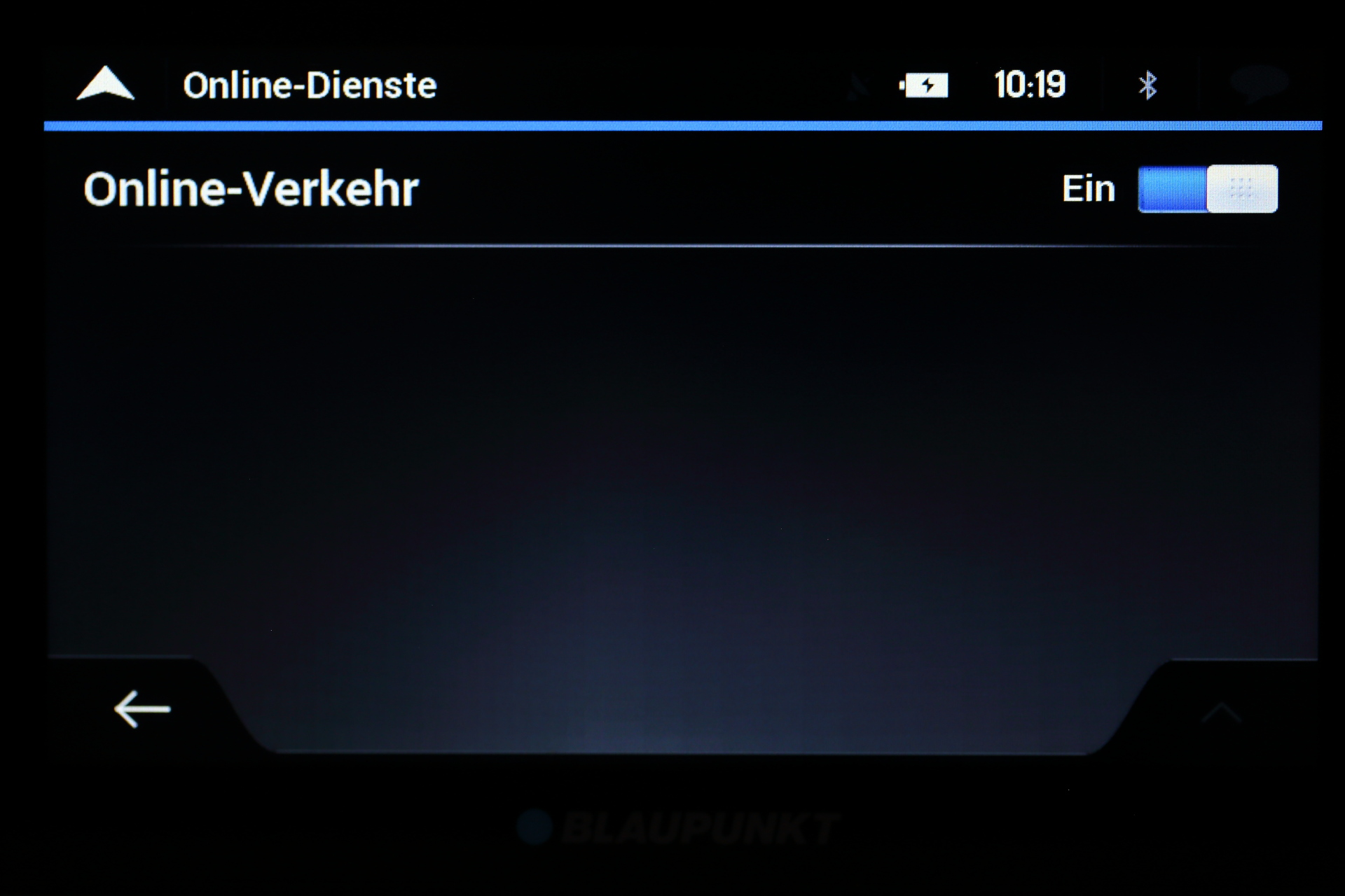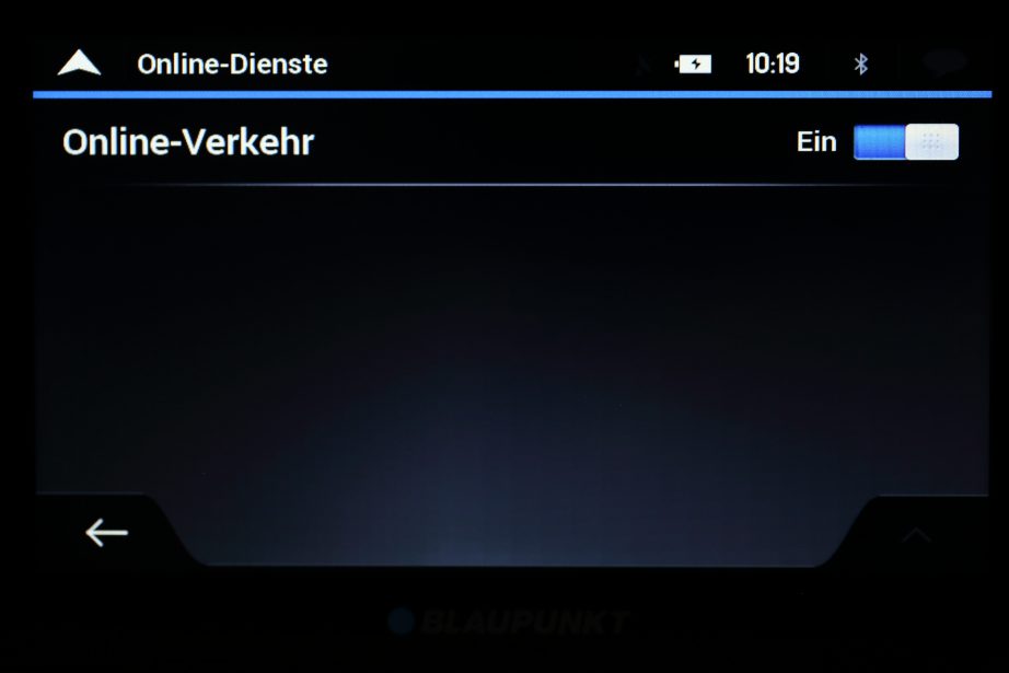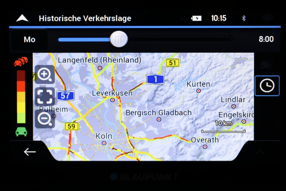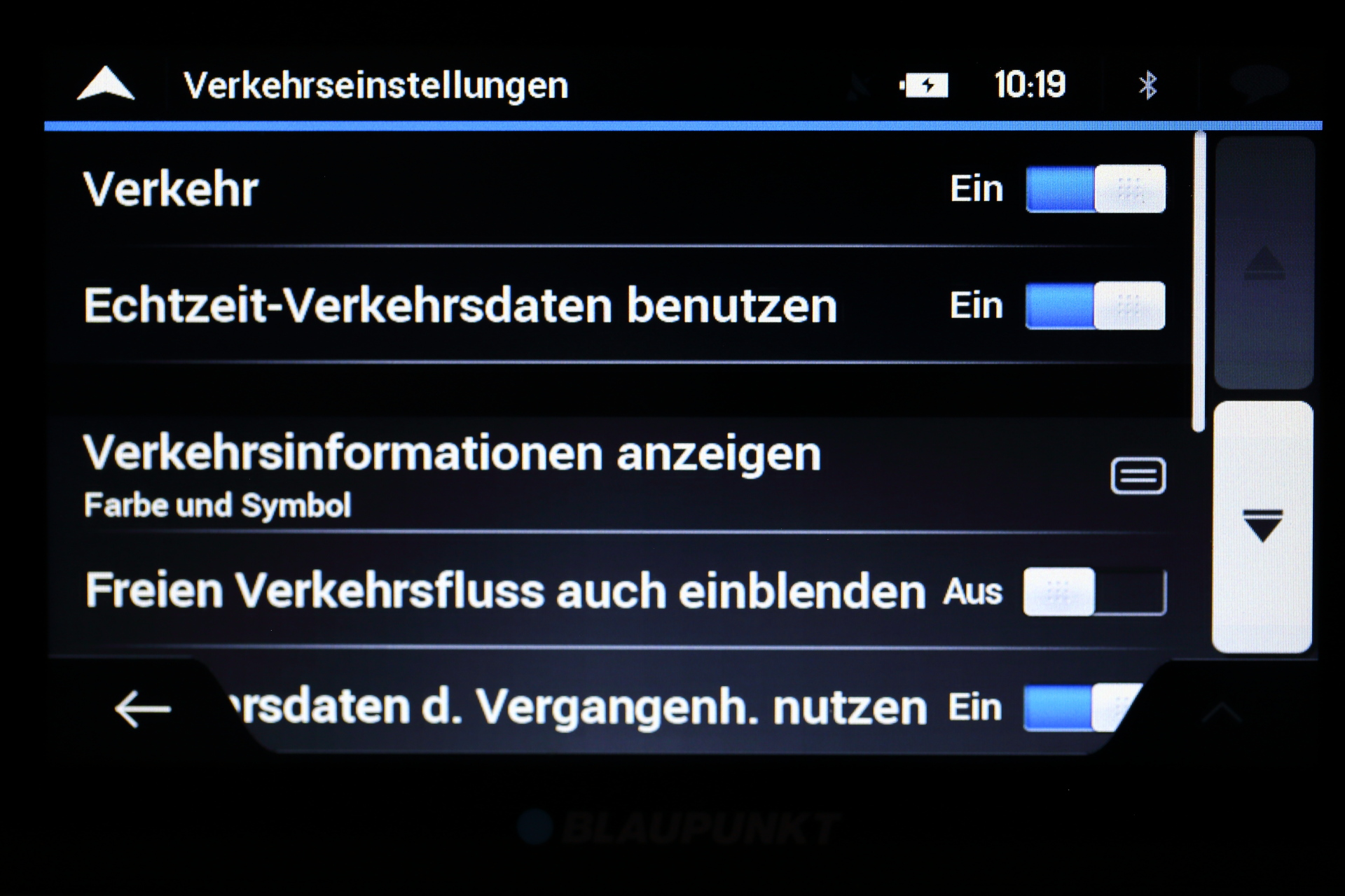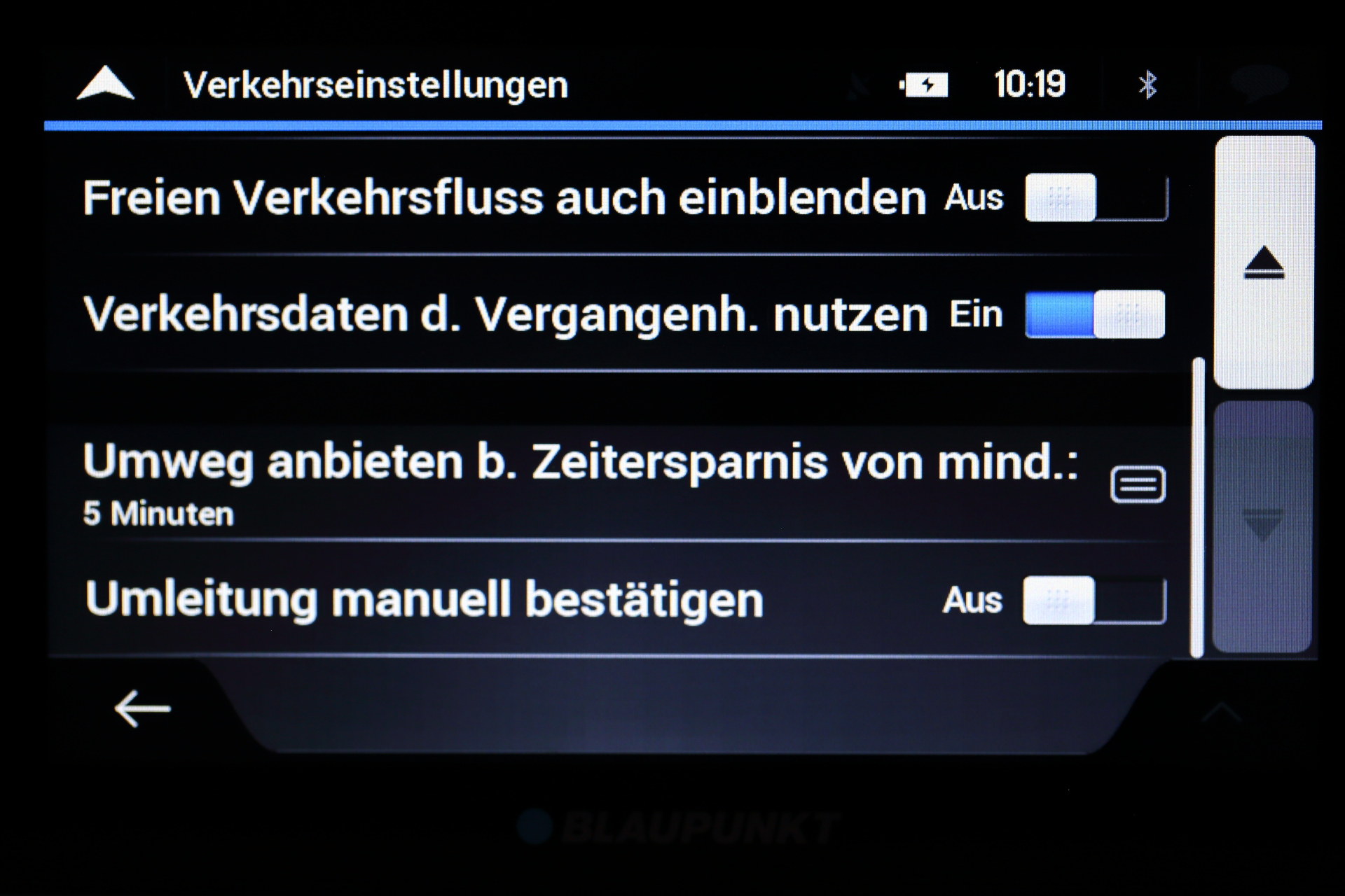 Damit die Online-Verkehrslage funktioniert, muss das Smartphone zunächst mit dem Blaupunkt Navi in den Bluetooth-Einstellungen gekoppelt werden. Das ganze sollte vor Fahrtantritt geschehen, da es nicht automatisch funktioniert und einige Tastendrücke erforderlich sind. In unserem Test hatten wir auf den ersten Fahrten deutliche Schwierigkeiten die Online-Verkehrsdaten via Bluetooth zu empfangen. Zwar war das Smartphone laut den Einstellungen erfolgreich gekoppelt worden, doch die aktuellen Verkehrsbehinderungen auf unserer Route wurden nicht beachtet. Die Daten schienen daher nur TMC-basiert zu sein. Nach einigem Probieren gelang es uns schlussendlich doch die Online-Verkehrsdaten auf dem Navi zu empfangen.