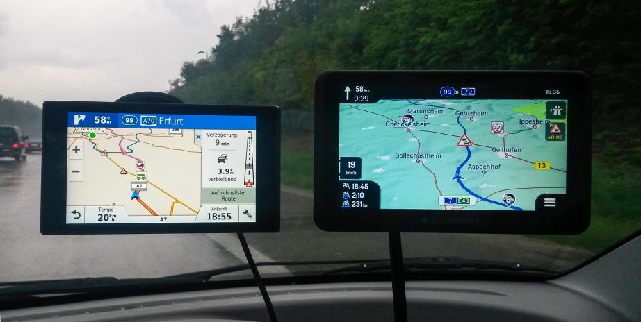 Die folgenden Fotos zeigen exemplarisch die Darstellung und Funktionen während eines Staus auf der A7 Richtung Schweinfurt. Wie man auf dem ersten Foto sehen kann, hat das Garmin DriveLuxe 51 den Stau mit Hilfe der TMC-Antenne (ohne Smartphone Link App für Online-Verkehr) besser eingeschätzt, als das Blaupunkt TravelPilot 65 mit gekoppeltem Smartphone für Online-Verkehrsmeldungen. Beim Blaupunkt Navi wurde der Stauanfang zu weit entfernt verortet sowie die Staulänge und die berechnete Verzögerungszeit zu gering eingestuft.