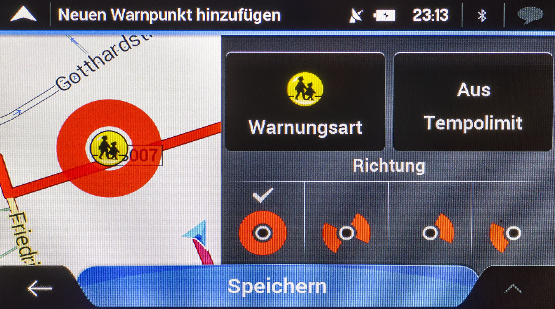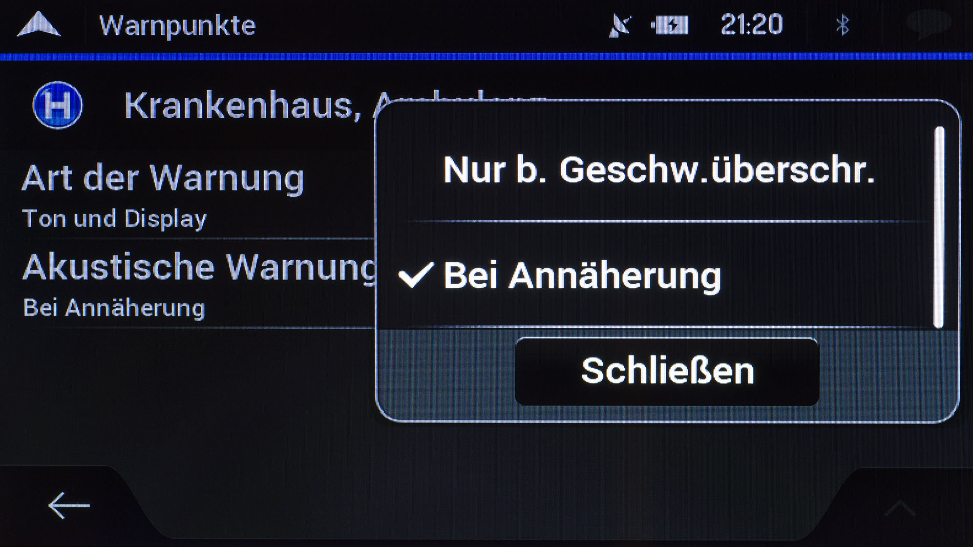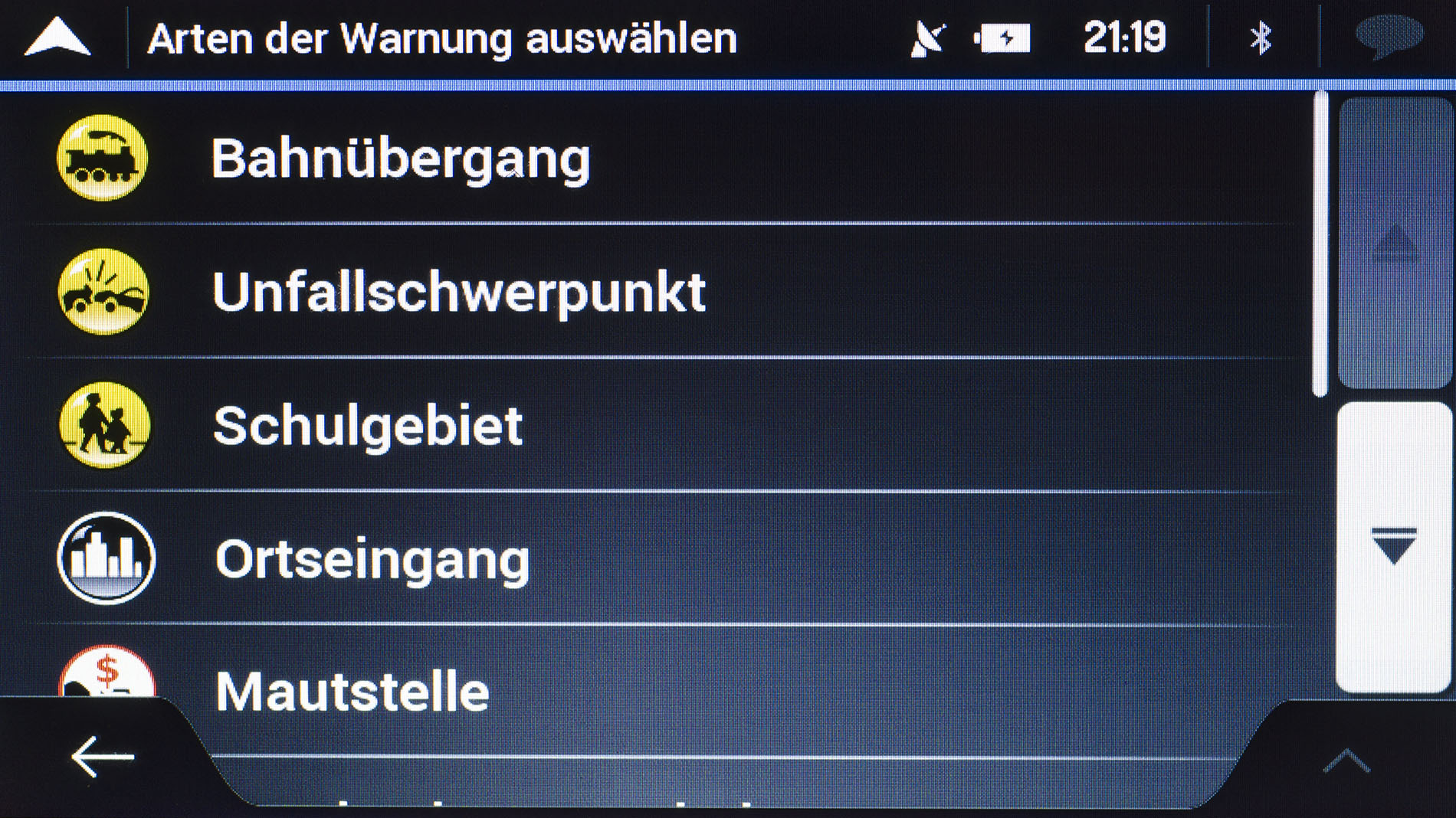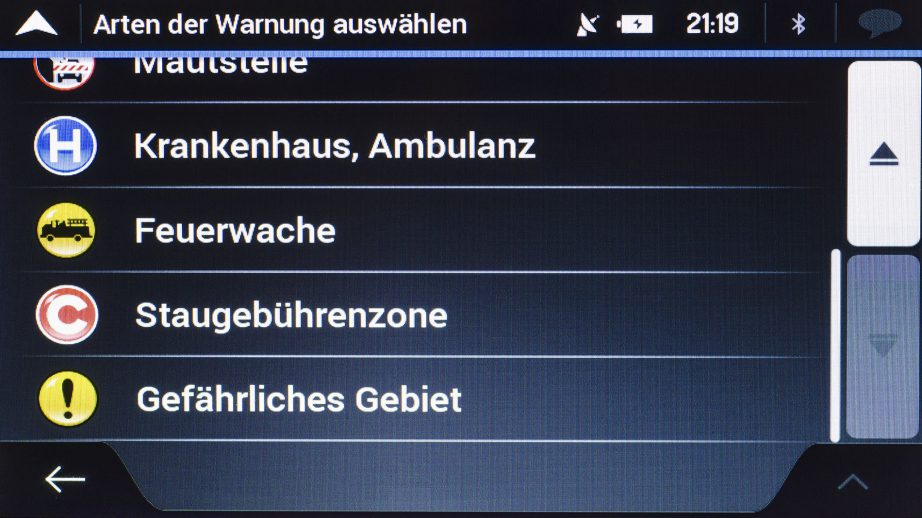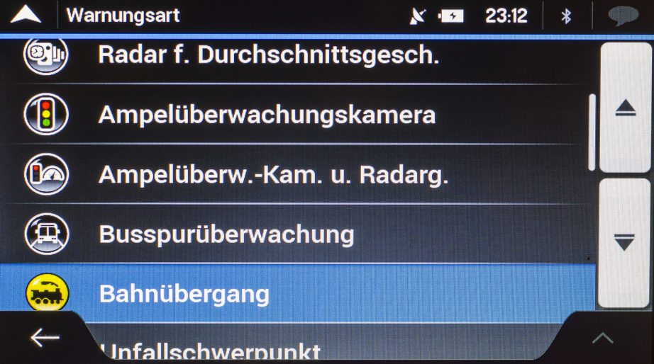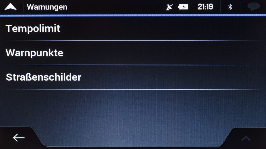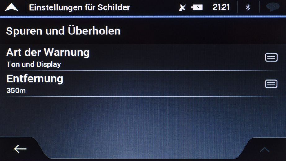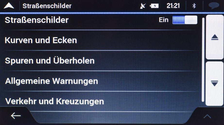 Zuletzt kann zu so genannten Straßenschildern gewarnt werden. Ob „Kurven und Ecken“ oder „Verkehr und Kreuzungen“ es kann bei jedem Punkt erneut die Art der Warnung bestimmt werden. Auch die Entfernung ab der gewarnt werden soll, kann jeweils von 50 Metern bis zu einem Kilometer in 50 Meter-Schritten festgelegt werden.
