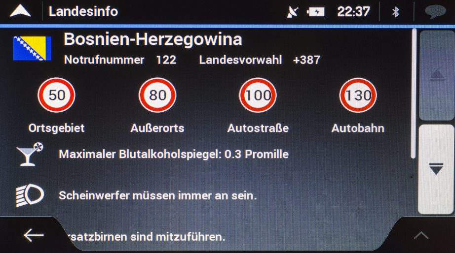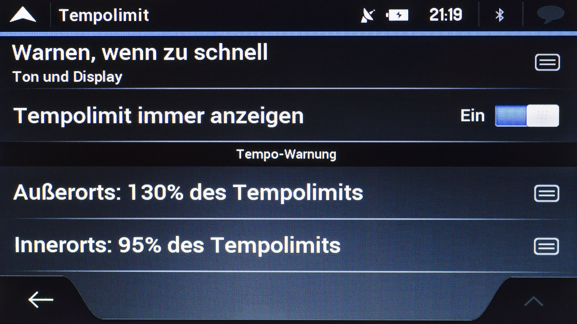Wen bspw. das dargestellte Tempolimit auf Dauer stört, kann es nur kurzzeitig einblenden lassen. Die Möglichkeit die Tempo-Warnungen außerorts und innerorts separat von 70 – 130 Prozent in 5 Prozent-Schritten einstellen zu können, hat uns besonders gut gefallen.