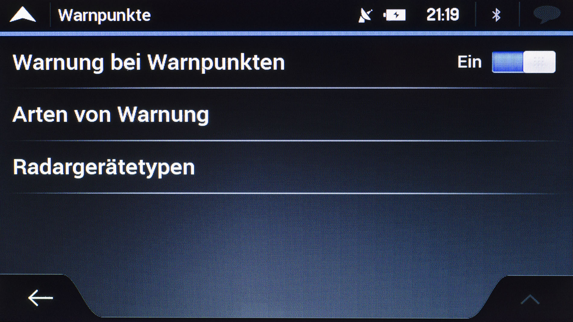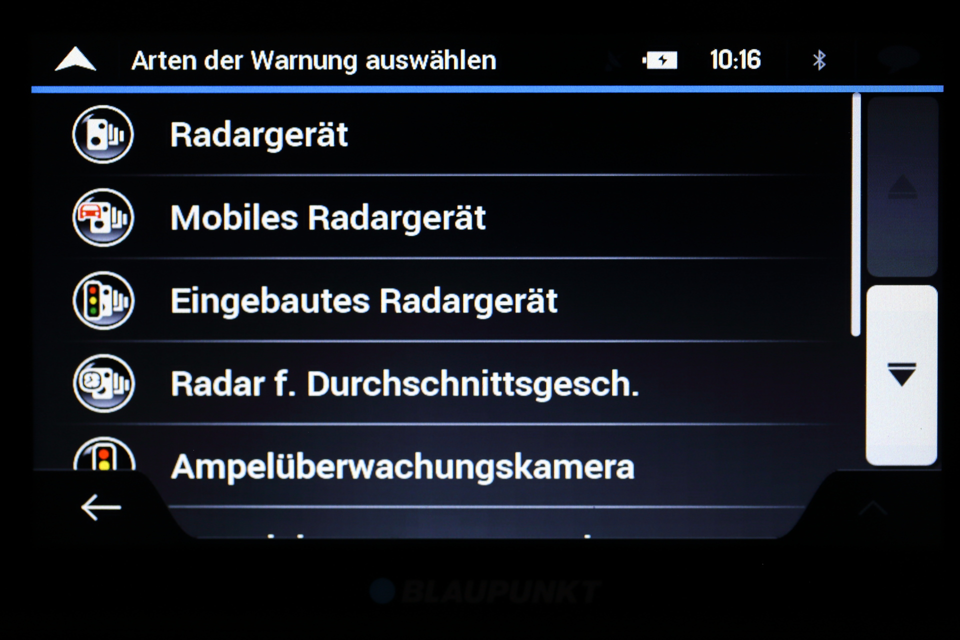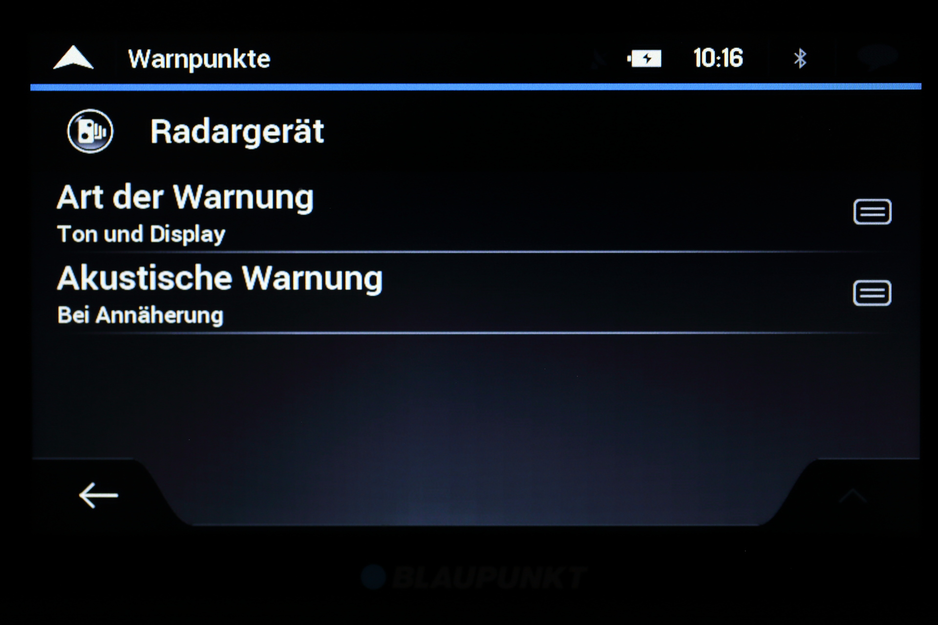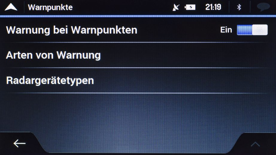 Unter Warnpunkten versteht Blaupunkt zum einen kritische Punkte oder Gebiete wie Bahnübergänge, Schulen oder Krankenhäuser. Zum anderen werden die verschiedensten Blitzertypen darunter aufgeführt. Für jeden dieser Punkte gilt eine individuelle Einstellmöglichkeit zur Art der Warnung (Deaktiviert / Display / Ton und Display) sowie zum Ton (bei Annäherung/ nur bei Geschwindigkeitsüberschreitung).