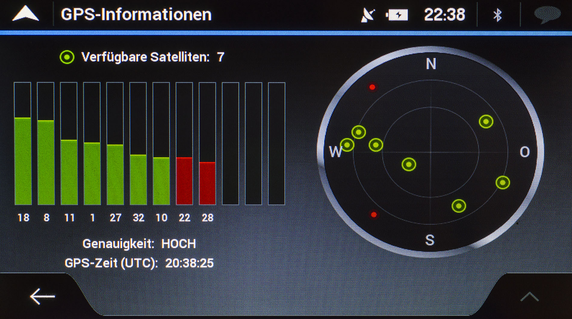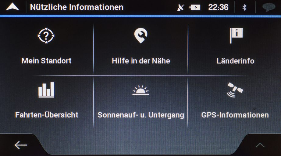Unter dem Titel „Nützliche Informationen“ bietet der TravelPilot 65 im Menü einige Infos an, die in speziellen Fällen nützlich werden könnten. Die unteren Abbildungen zeigen die Funktionen im Detail, welche von Notfalladressen, verfügbaren GPS-Satelliten bis hin zu Sonnenaufgangs- und Sonnenuntergangszeiten reichen.