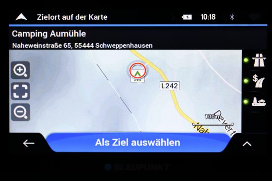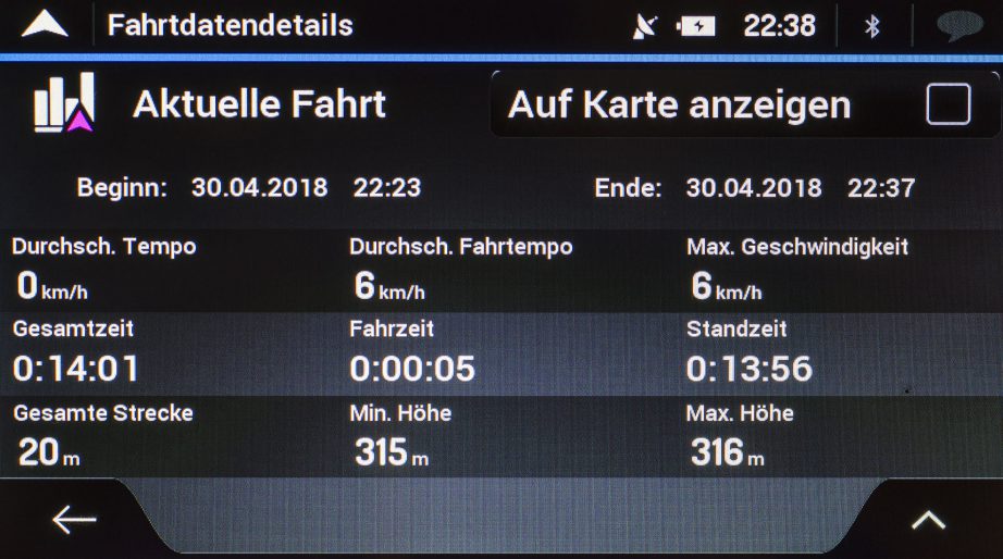 Der Fahrtcomputer des Blaupunkt Navis gibt auf einen Blick eine Vielzahl an reisespezifischen Informationen wieder. Unter anderem zeigt es die Distanz, Ankunfts- und Restzeit bis zum Ziel bzw. dem nächsten Zwischenziel, die Höhe, die Geschwindigkeit und die Himmelsrichtung. Im Fahrtüberblick können weitere Infos wie Fahrtzeit- und Pausenzeiten eingesehen werden. Gleichzeitig lassen sich hier auch die gesamten Daten der aktuellen Fahrt abspeichern.