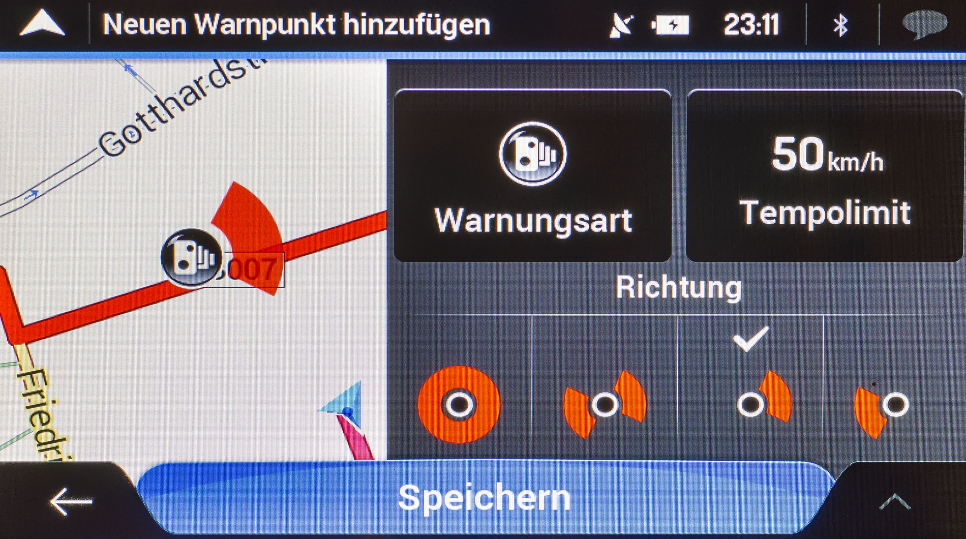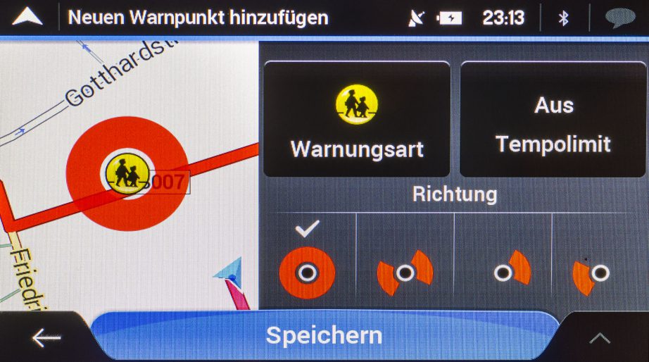 Besonders gelungen beim TravelPilot ist die zusätzliche Möglichkeit neue Blitzer-Standorte schnell und unkompliziert für den eigenen Gebrauch abzuspeichern. Hierfür berührt man zunächst die gewünschte Stelle auf der Karte, wählt dann im Menü einen „Neuen Wegpunkt hinzufügen“ aus, stellt die Ausrichtung für die richtungsabhängige Warnung ein und fertig ist die individuelle Warnung. Auf diese Weise können nicht nur Blitzer sondern auch alle anderen Arten von Warnpunkten erstellt werden.