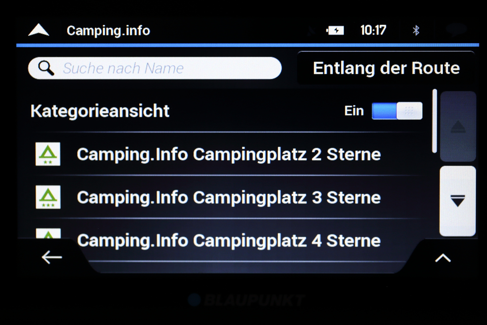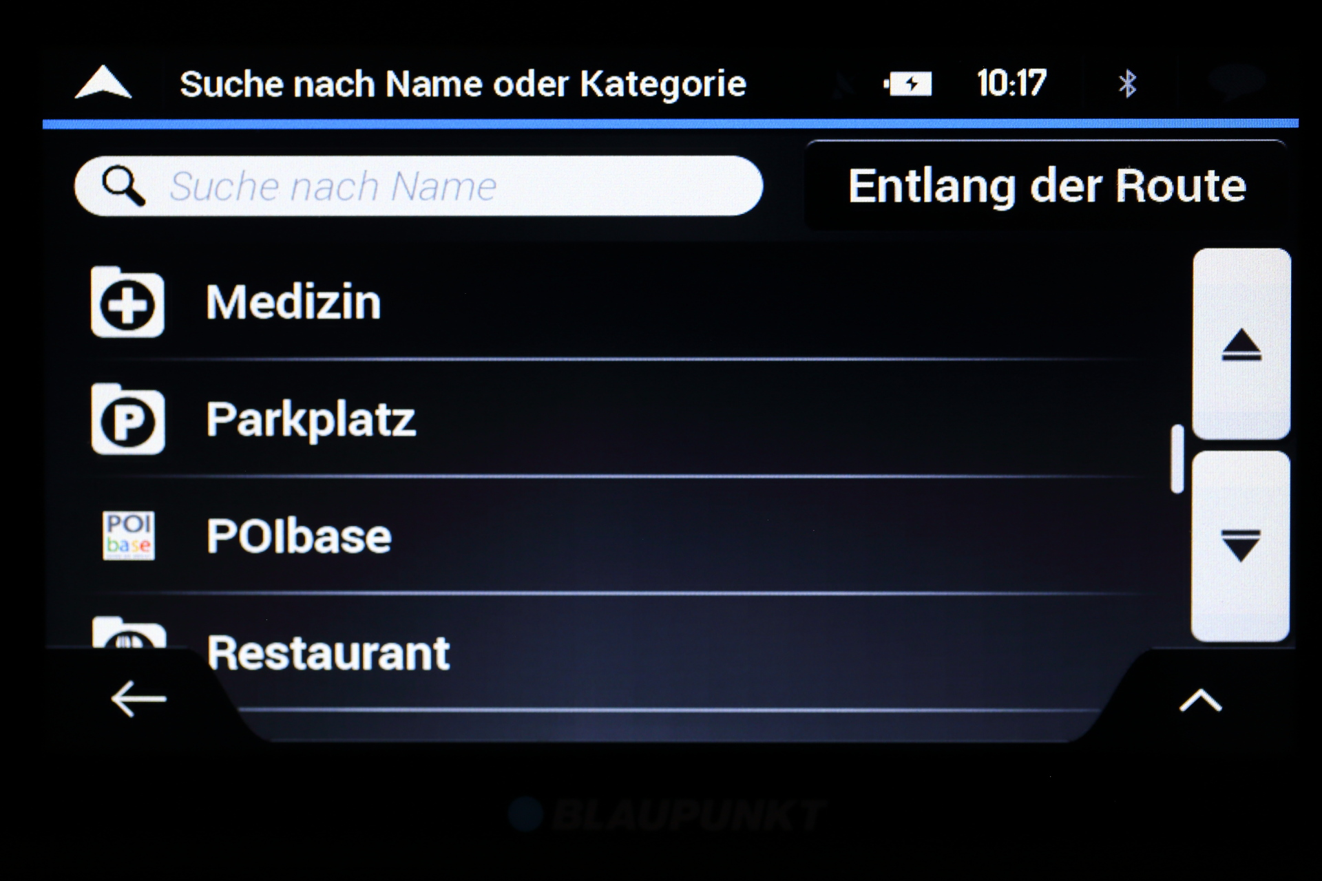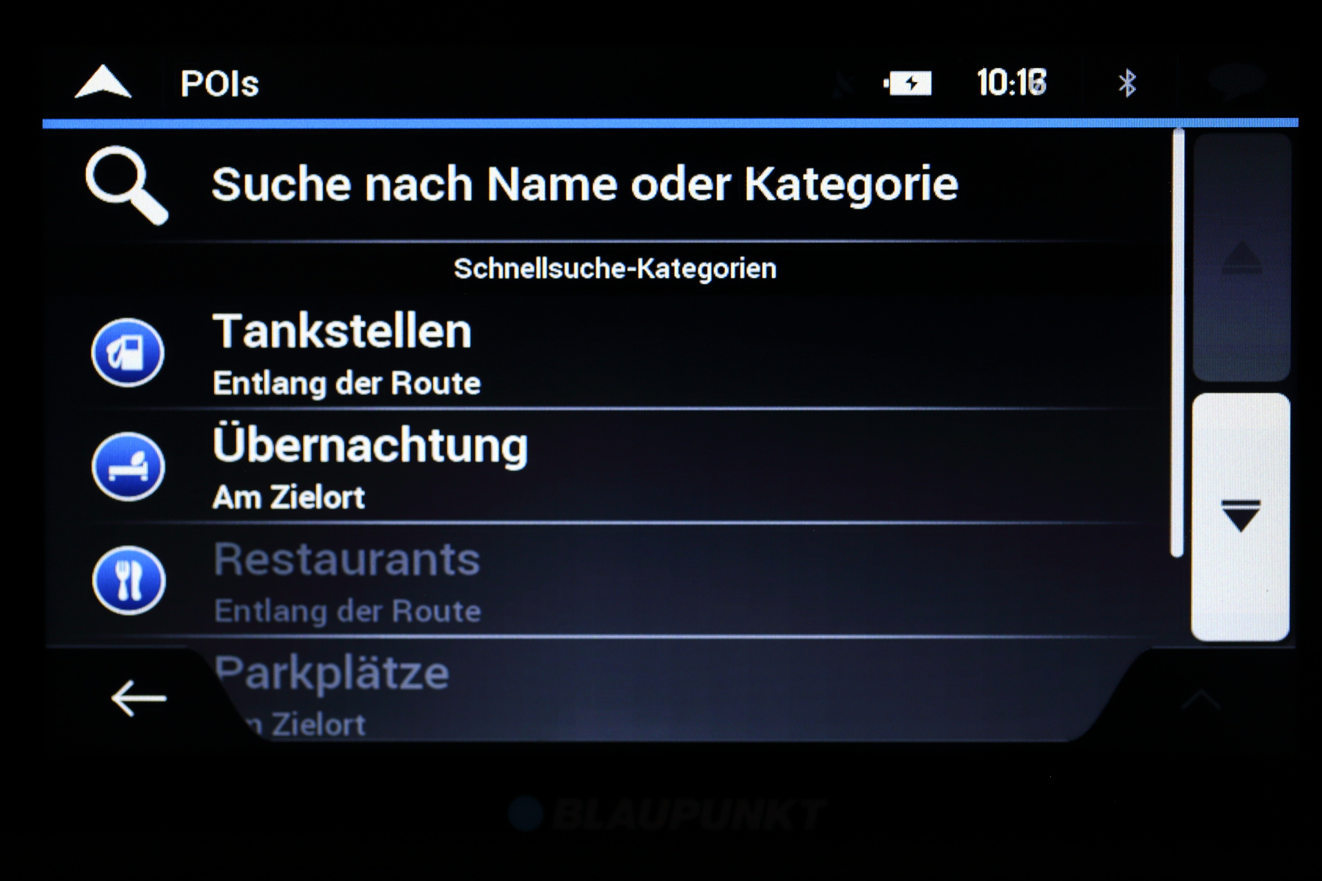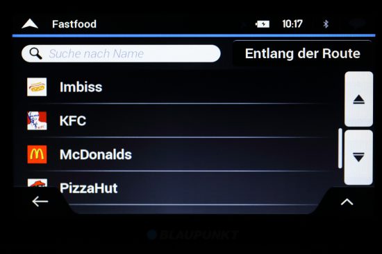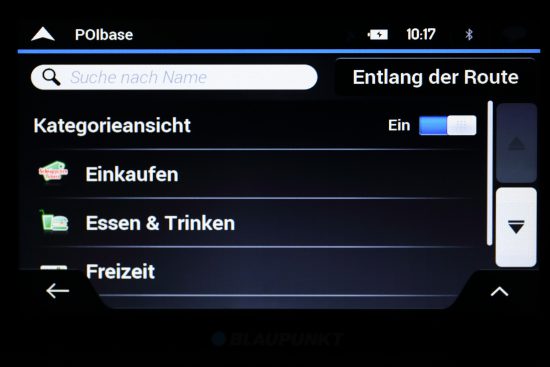 Das Blaupunkt TravelPilot Active 65 verfügt über vorinstallierte POIs. Gewünschte POIs können entweder über eine Suche anhand von Namen und Kategorien oder über die vorgegebenen Schnellsuche-Kategorien gefunden werden. Die Möglichkeit die Suche immer wieder auf folgende Bereiche anpassen zu können, ist dabei besonders praktisch: