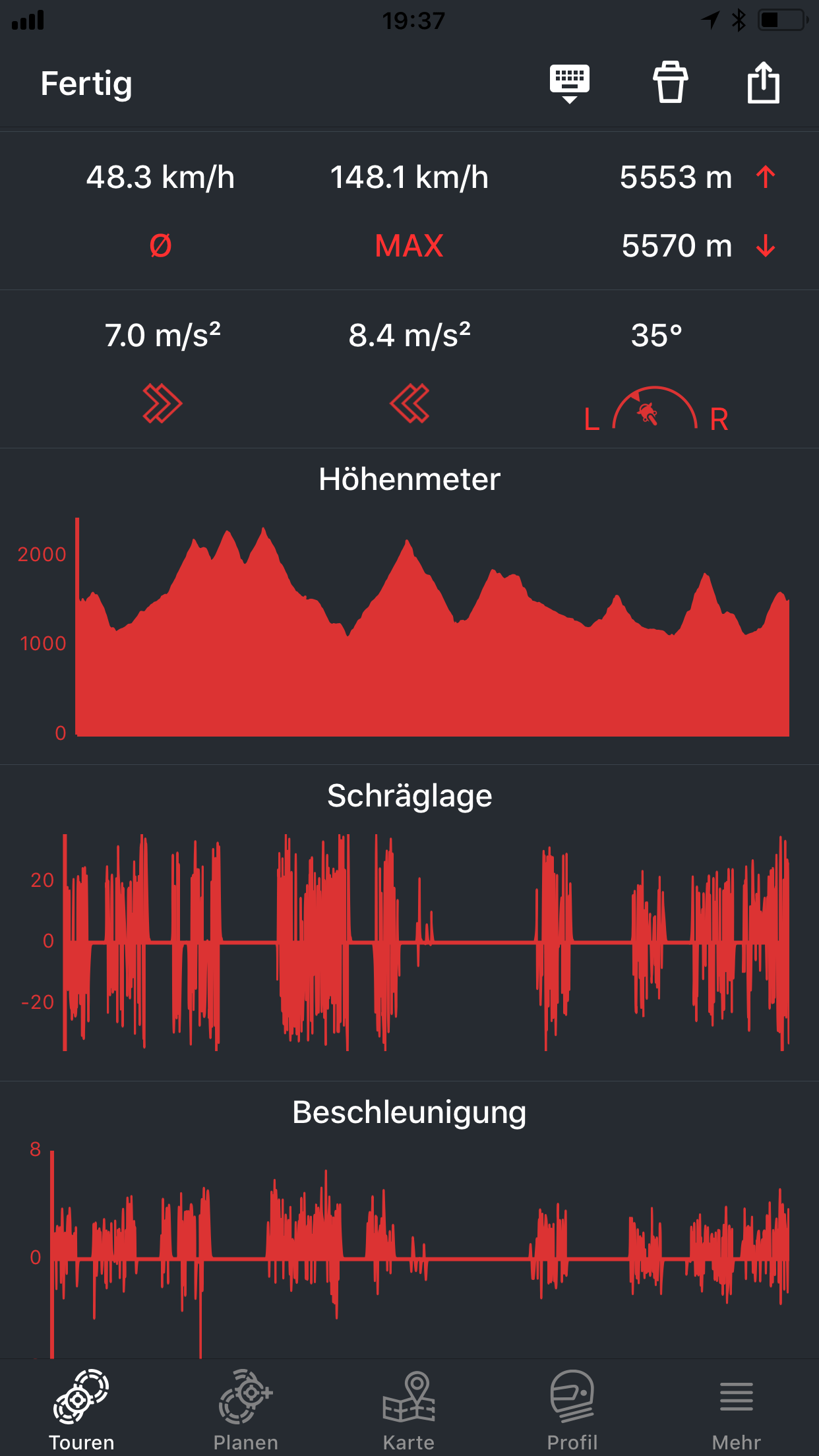 Gefahren Strecken kann die calimoto App umfangreich auswerten. Der Tripcomputer zeigt nicht nur die gefahrenen Kilometer, sondern analysiert jede Tour anhand von Schräglage, Beschleunigung und Höhenmetern.