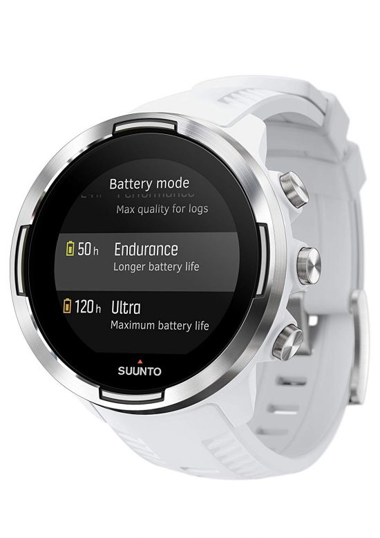 Doch was unterscheidet diese Uhr von den vielen anderen Fitness Uhren auf dem Markt? Die Suunto 9 überzeugt mit einer unschlagbaren Batterielaufzeit von bis zu 120 Stunden, bei eingeschaltetem GPS. Doch nicht nur das, auch ein intelligentes Batterielaufzeit-Steuerungssystem, ist in die Uhr integriert worden. Es kann zwischen drei Batteriemodi gewählt werden. Ist der Modus mit dem höchsten Verbrauch ausgewählt, hält die Uhr dennoch ganze 25 Stunden mit eingeschaltetem GPS. Der Sparmodus bringt es hingegen auf ganze 120 Stunden. Im Vergleich hält die Garmin Forerunner 935 im stromsparenden UltraTrac-Modus nur 60 Stunden durch.