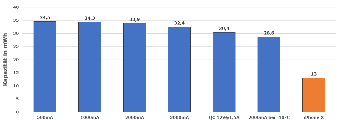 Beide Akkus haben eine nahezu identische Kapazität. Ein Versuch die Akkus bei -20°C zu entladen ist gescheitert, der Akku konnte keine Ausgangsspannung erzeugen. Die Kapazität reicht aus um selbst große Smartphones wie das iPhone X (Akku 2700mAh bzw. 10,3wh) mehr als 2 x komplett zu laden. Viele kleinere Tablets können zumindest 1 x komplett geladen werden. Die gemessene Ausgangskapazität entspricht immerhin 90,7% der Herstellerangabe für den internen Akku, was für eine effiziente Spannungswandlung und ehrliche Kapazitätsangabe spricht.