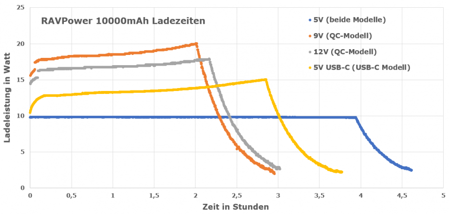 Die schnellste Ladung erfolgt mit dem RAVPower 10000mAh QC Powerbank erstaunlicherweise nicht im 12 Volt sondern im 9 Volt Modus. Das USB-C Modell kommt an die Ladezeiten des QuickCharge 3.0 nicht herran, ist aber immerhin deutlich schneller als die Standard-Ladung über 5V USB. Für die Ladung wird folgende Energie benötigt: