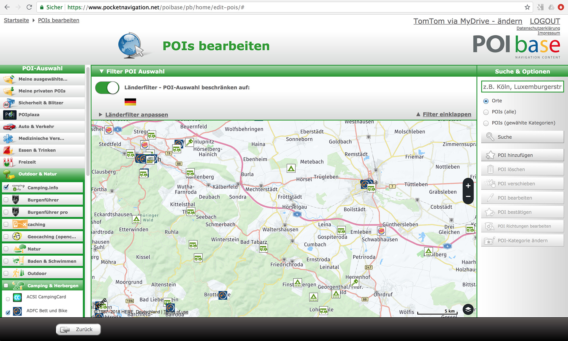 Über den POIbase Shop oder in der POIbase-Plattform unter Sicherheit Blitzer lassen sich auch kostenpflichtige Blitzerdaten freischalten. Auch für Camping-Fans gibt es entweder kostenlose POIs oder ein kostenpflichtiges Camping- und Stellplatzführer POI-Paket der beliebten Camping.info-Webseite. Mit POIbase lassen sich auch Länder- und Umkreisfilter erstellen um die Anzahl von POIs effektiv zu begrenzen. So wird auch die begrenzte Rechenkapazität von portablen Navigationssystemen nicht überlastet. Es können auch eigene CSV, KML oder GPX-Dateien importiert werden. Auch auf diesem Weg erstellte private POI-Kategorien lassen sich über die Karte bearbeiten oder um neue POIs erweitern. Die POIbase Datenbank wächst ständig weiter und wird dabei von seiner großen Community unterstützt und der POIbase -Redaktion begleitet.