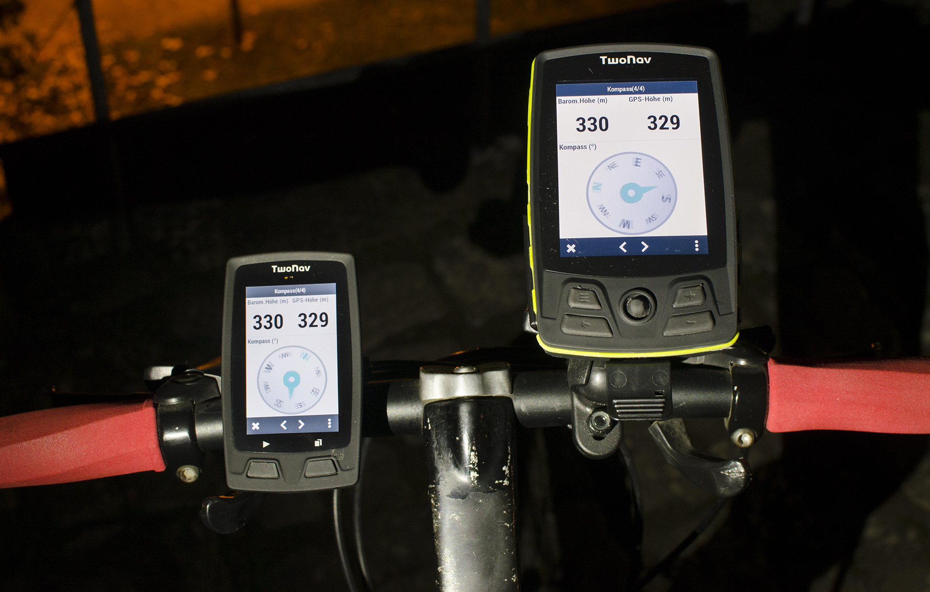 Beide Navigationsgeräte haben während der Fahrt mit dem Fahrrad die ermittelten Werte in Echtzeit angezeigt. Als wir vor dem zweiten Höhenfestpunkt stehen geblieben sind, blieben die jeweils ermittelten Werte unverändert. Die Präzision der Sensoren ist demenstprechend hoch und liefert zuverlässigere Werte als Geräte mit Ergebnissen in Toleranzbereichen (wie ±10 Meter). Nutzt man seine TwoNav Geräte für sportliche Aktivitäten kann man somit die Trainingsbelastung noch genauer abschätzen. Das regelmäßige Kalibrieren der barometrischen Höhenmesser vorausgesetzt.