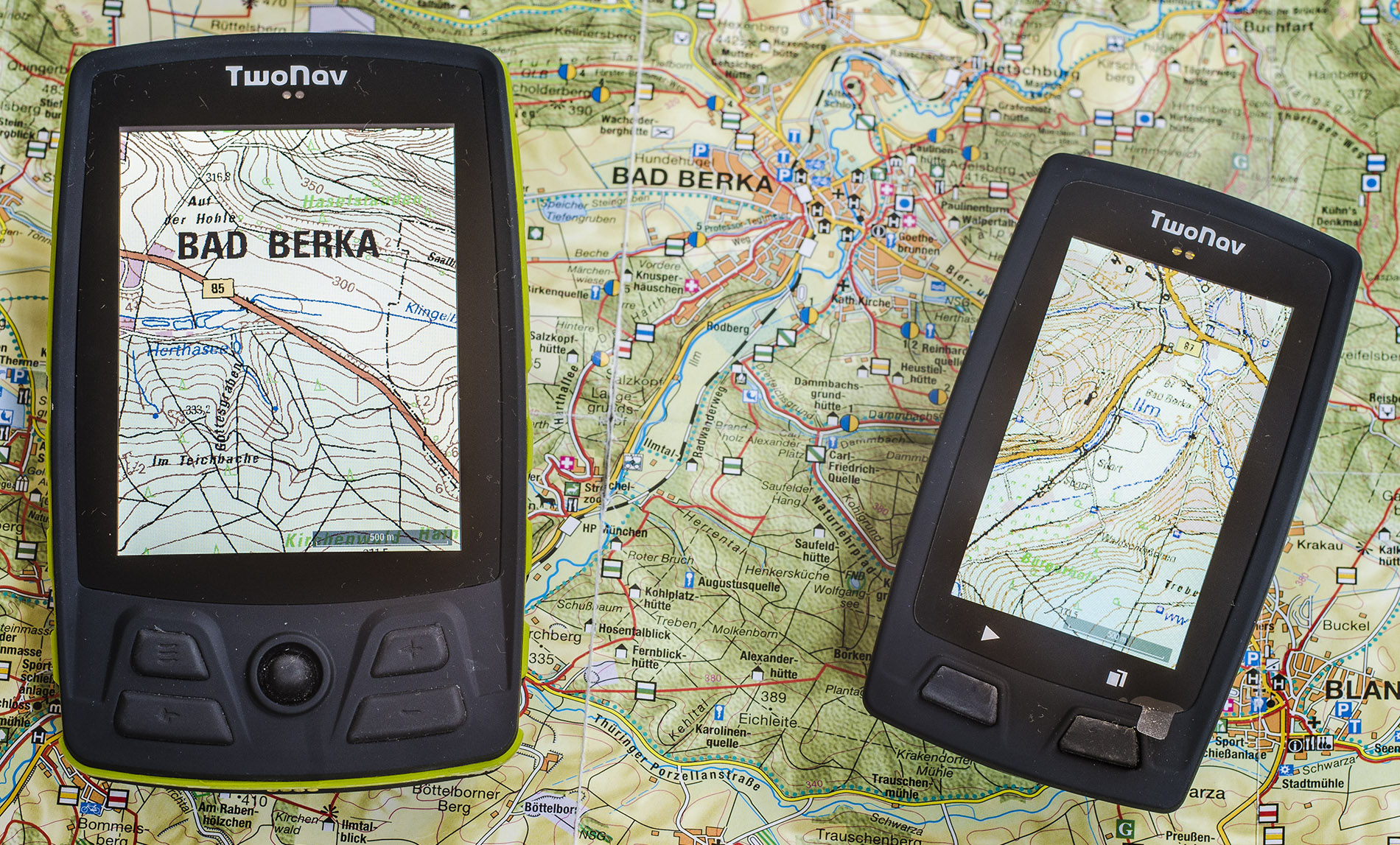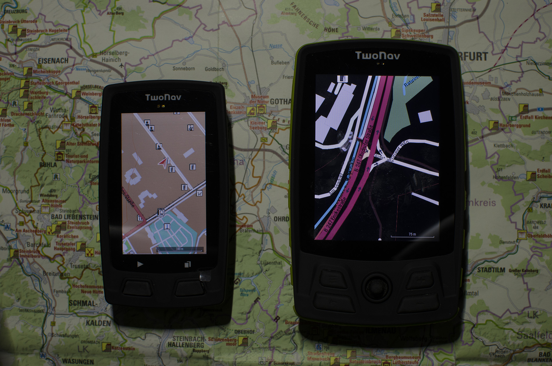 Die Gehäuseform der beiden neuen TwoNav Modelle hat sich gegenüber den bisherigen Geräten des spanischen Herstellers CompeGPS deutlich verändert. Sie sind wesentlich eckiger und damit auch markanter geworden. Besonders deutlich zeigt sich diese Veränderung zwischen dem von Rundungen dominierten 2009er Aventura und dem von uns getesteten TwoNav Aventura. Auch wenn das TwoNav Horizon keinen Vorgänger im eigentlichen Sinne hat, ist es in Form und Größe dem TwoNav Anima+ aus dem Jahre 2014 doch sehr ähnlich.