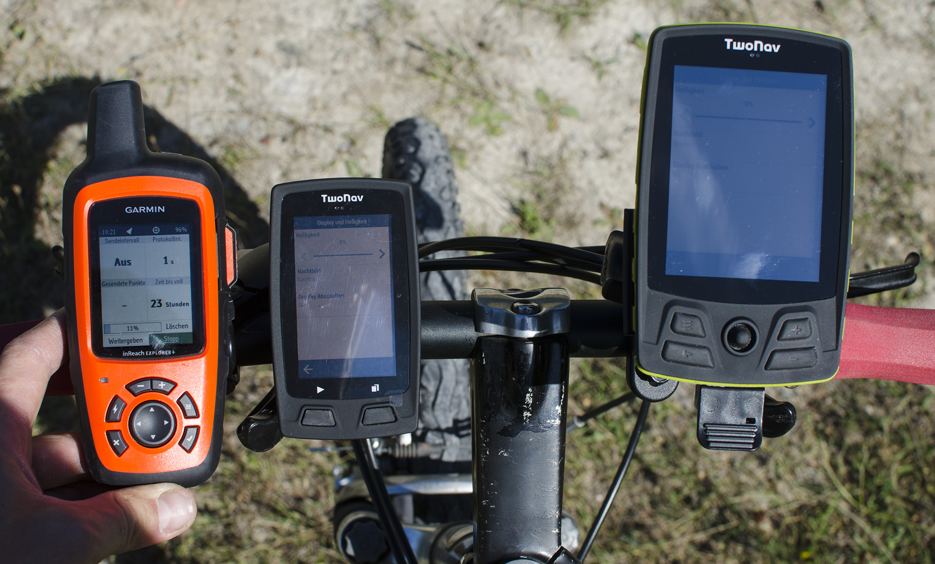 Auch wenn die TwoNav Navis den Garmin Geräten bei Sonnenlicht zwar nicht das Wasser reichen können, so ist zumindest das TwoNav Aventura ihnen in puncto Hintergrundbeleuchtung um Meilen voraus. Im Vergleich mit einem Garmin inReach Explorer+ ist die Beleuchtung des Aventura deutlich heller und sowohl dessen Farben als auch Kontrast sind wesentlich besser geeignet für eine komfortable Navigation als die des inReachs. Der beim TwoNav Aventura verbaute Display ist ein Blanview-LCD, welcher besonders stoßfest sein soll. Er wurde von Casio entwickelt und ist für den stetigen Gebrauch in toughen Arbeitsumgebungen konzipiert und erprobt. In unserem Test konnte er uns im Schatten und bei Nacht eindeutig überzeugen. Das TwoNav Horizon schwächelt leider bei der Hintergrundbeleuchtung. Es wirkt zwar immer noch etwas heller als beim inReach Explorer+, doch die Funktionalität leidet durch verwaschene Farben und den schwachen Kontrast. In diesem Fall hat also auch hier das inReach die Nase vorn.