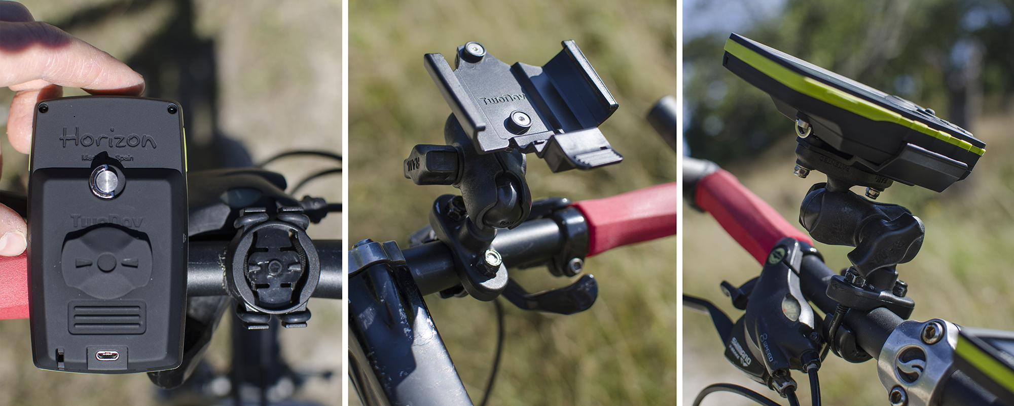 Auch dem TwoNav Horizon Bike liegt ein Fahrradhalter bei. Dieser ist ist wesentlich kleiner und über die Gummis schneller am Fahrradlenker zu fixieren. Durch das QuickLock Prinzip, kann das Horizon über eine 90-Grad-Drehung zügig aus der Halterung geholt werden. Allerdings sitzt es lange nicht so stabil wie im RAM Mount, das Ablesen des Displays auf huckeligen Pisten ist trotzdem gut machbar.