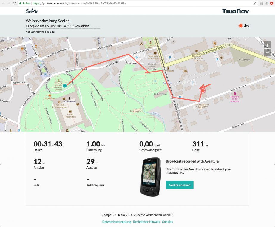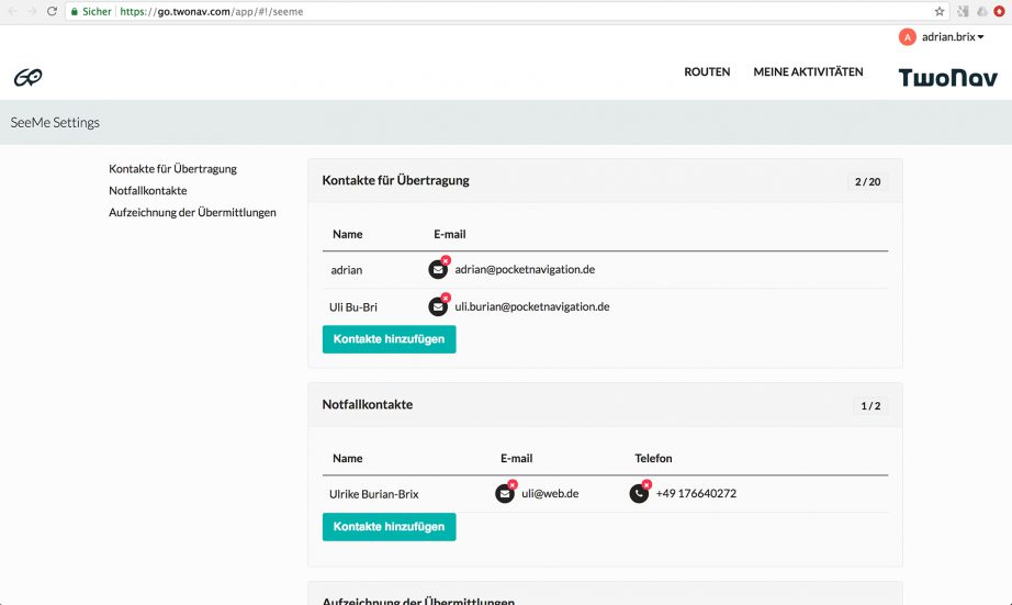 Hierüber können bis zu 10 Freunde und Familienmitglieder die Tour eines TwoNav-Nutzers in Echtzeit mitverfolgen. Das SeeMe Feature ist kostenpflichtig, ist bei beiden Geräten aber in den ersten 6 Monaten kostenlos. Für den SeeMe Service besitzen beide Geräte wie oben beschrieben eine integrierte SIM-Karte mit der das Gerät im 5-minuten Takt die Koordinaten des Nutzers via GPRS Mobilfunk versendet. Wird eine Aktivität bei eingeschalteter „Übertragung“ gestartet, erhalten die SeeMe-Kontakte eine eMail mit dem Link (derzeit noch komplett auf Spanisch) um die Aktivität live mitverfolgen zu können. Neben der zurückgelegten Distanz ist auch das derzeitige Höhenprofil, die Durchschnittsgeschwindigkeit,die Herz- und Trittfrequenz einsehbar.