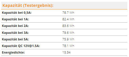 Die höchste Kapazität wird bei 2A erreicht (typischer Ladestrom moderner Smartphones) und liegt immerhin bei über 90% der internen Kapazität was ein sehr guter Wert ist.