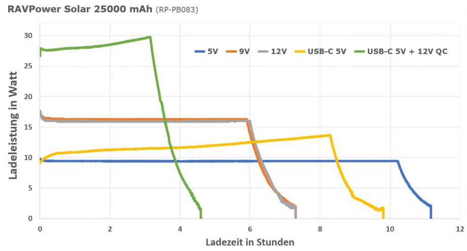 Irgendwann ist auch die größte Powerbank leer und muss wieder geladen werden. Der RAVPower Solar Charger 25000mAh kann über Mirco-USB oder USB-C geladen werden. Es ist sogar möglich über USB-C A und Micro-USB (QC) parallel zu laden und so die Ladezeit dramatisch zu verkürzen. Wir haben folgende Ladeleistungen- und Zeiten gemessen:
