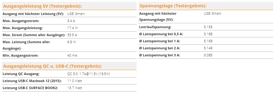 Alle drei Ausgänge können parallel genutzt werden wobei sich der iSmart und der USB-C Ausgang den maximalen Ausgangsstrom (3,0A laut Hersteller, 3,4A in unserem Test) teilen. Es können also zwei Geräte parallel an USB-C und iSmart (USB-A) geladen werden, aber unter Umständen nicht mit der maximal möglichen Ladegeschwindigkeit. Der USB-A QC 3.0 Ausgang hingegen ist bzgl. seiner Leistung von den anderen beiden Ausgängen unabhängig.