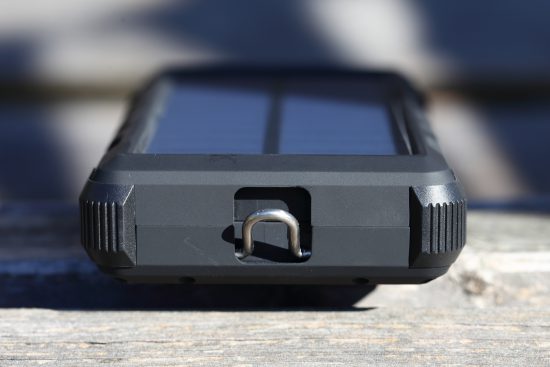 Die Powerbank besteht gummierten Kunststoff und wirkt überaus robust. Die Ecken sind mit einem zusätzlichen Stoßschutz verstärkt, die Seiten sind geriffelt und damit besonders griffig. Die Powerbank verfügt über eine klappbare Metallöse, darüber besteht die Möglichkeit die Powerbank z.B. mit einem kleinen Karabiner an der Ausrüstung zu befestigen. Die Aus- und Eingänge sind mit Schutzkappen gegen Feuchtigkeit und Spitzwasser gut geschützt. Die Solarzellen liegen etwas tiefer und sind so ebenfalls gut gegen Kratzer und Beschädigung geschützt. Alles in allem ist die Powerbank zwar nicht vollständig wasserdicht aber auf jeden Fall sehr robust, outdoor-tauglich und hervorragend verarbeitet.