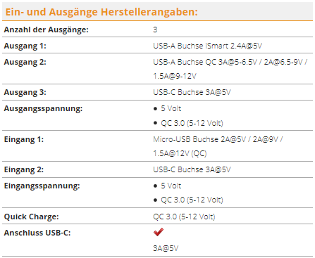 Einer der beiden USB-A Ausgänge ist als Qualcomm QuickCharge 3.0 ausgelegt. Über den Mico-USB Eingang kann ebenfalls QuickCharge 3.0 kompatibel mit bis zu 12 Volt schnell geladen werden.