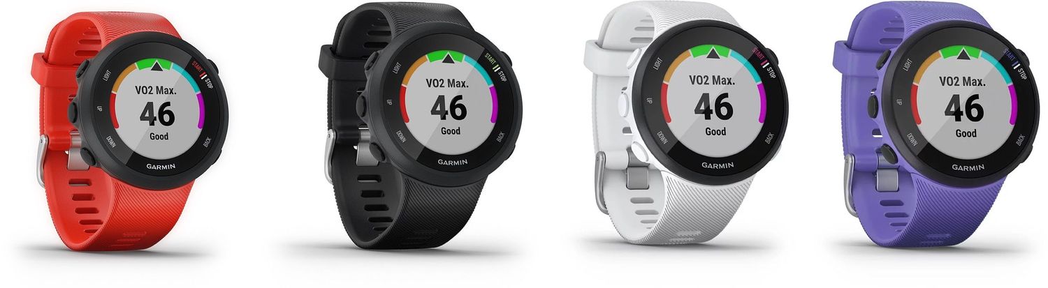 Die neue Forerunner kommt in 2 Modellvarianten auf den Markt. Die FR 45 hat eine Gehäusegröße von 42mm und wiegt 36 Gramm. Die kleinere Variante FR 45s wiegt nur 32 Gramm und hat eine Gehäusegröße von 42mm und ist damit bestens für schmale Handgelenke geeignet. Außerdem gibt es wohl die Auswahl zwischen vier Farben (rot, lila, weiß und schwarz).