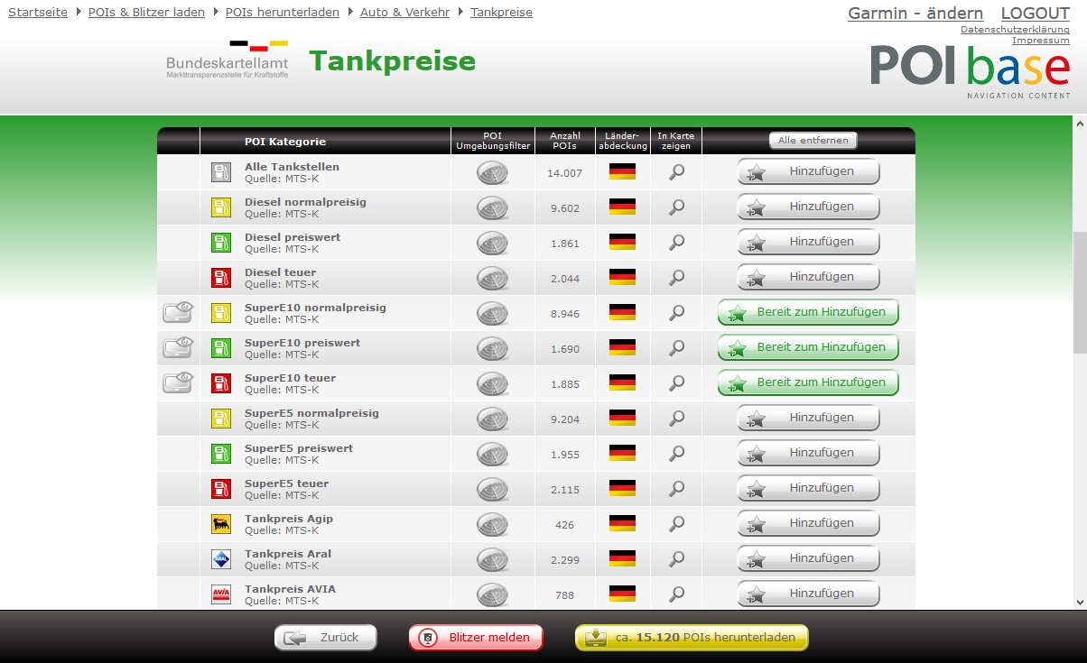 Zu finden sind die Tankpreise bei POIbase unter: “POIs Blitzer laden POIs herunterladen Auto Verkehr Tankpreise“.