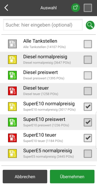 Ein Tipp noch zur Nutzung der Tankpreis-POIs: Um Überdeckungen der Icons auf der Karte zu vermeiden, sollte nur eine Spritsorte, diese aber mit allen drei Preiskategorien, ausgewählt werden. Wählt man mehr als eine Kraftstoffsorte, überdecken sich die Icons gegenseitig auf der Karte.