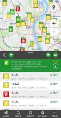 In unserer App POIbase für Android werden die tagesaktuellen Preise stündlich abgerufen und miteinander verglichen. Das Ergebnis des Vergleichs wird an den drei Tankstellen-Symbolen erkennbar, die in drei Farben auf der Karte erscheinen.