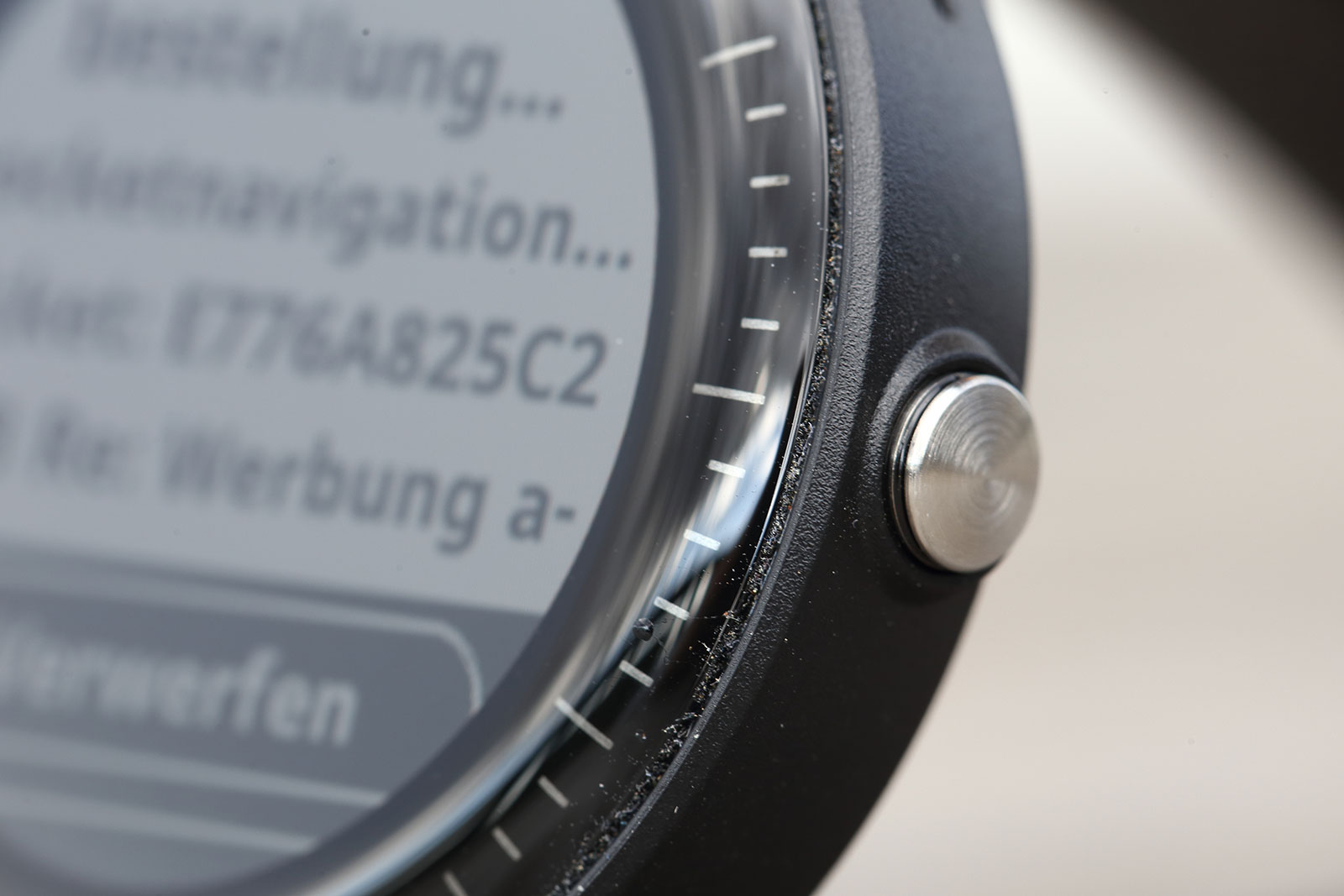 Die GPS-Uhr ist in der Music Variante nur mit dunklem Gehäuse erhältlich, dass entweder komplett Schwarz oder in Granitblau mit Teilen in Rosegold daherkommt. Die Lünette ist Teil des Displays und zum Gehäuserand hin leicht abgerundet, wodurch es etwas größer wirkt als bei der normalen vivoactive 3. Die von Garmin Geräten gewohnte, sehr gute Verarbeitungsqualität, können wir bei der vivoactive 3 Music so leider nicht bestätigen. Bei zwei Uhren, die wir während des Testverlaufs ausprobieren konnten, war deutlich der Kleber zwischen Lünette und Gehäuserand zu sehen. Beide Gehäuseelemente besitzen zudem ungewöhnlich scharfe Kanten.