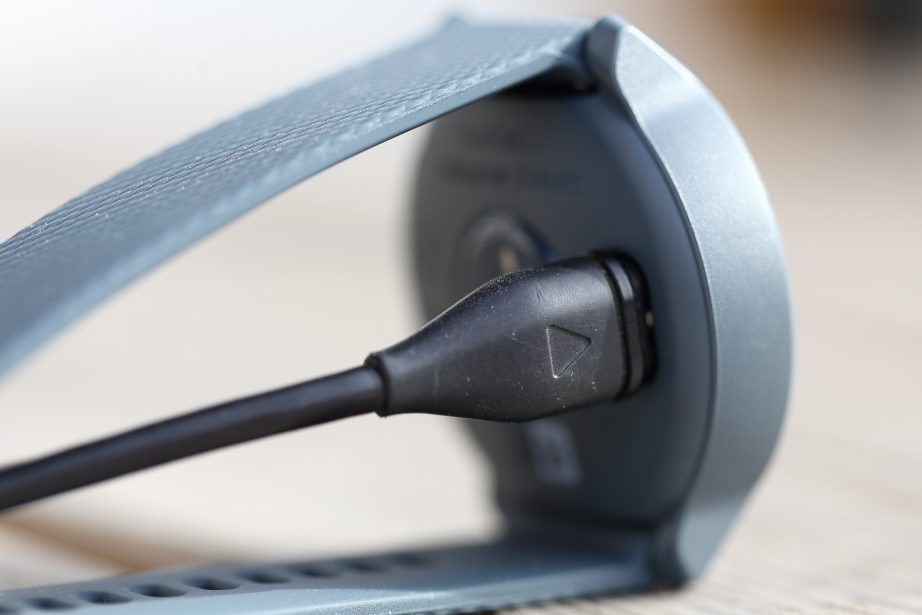 Geladen wird die Garmin vivoactive 3 Music über einen vierpoligen Anschluss auf der Rückseite. Dieser ist identisch mit den Anschlüssen von anderen aktuellen Garmin Uhren, etwa der vivoactive 3, der fenix 5 Serie oder der Forerunner 645 Music. Vorbei sind die Zeiten als Garmin für jede Uhr einen eigene Ladeanschluss entwickelte. Somit könne alle aktuellen Garmin Uhren mit dem gleichen Kabel aufgeladen werden. Über den Anschluss kann die Fitness Uhr aber auch zum Datenaustausch per USB mit einem Computer verbunden werden.