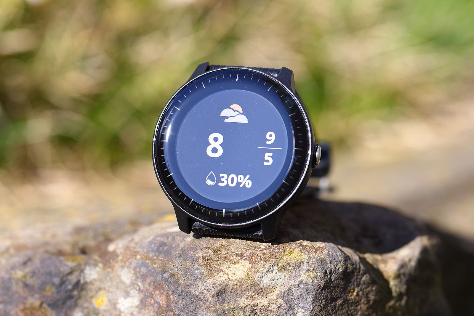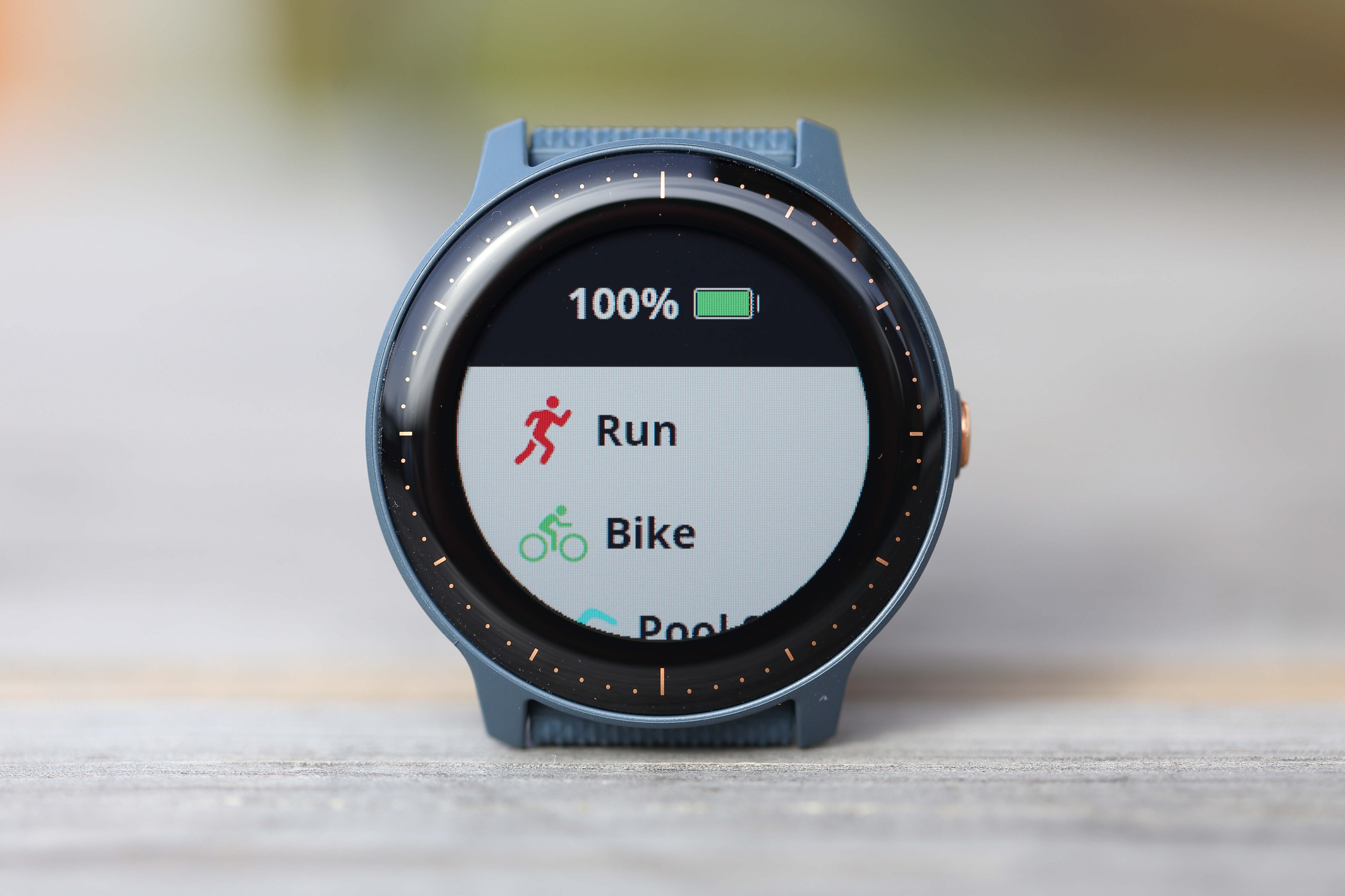 Mit der seitlichen Taste kann von jedem Widget aus schnell zurück zur Uhrzeitanzeige gesprungen werden. Auf dem Uhrzeitwidget ruft ein Tastendruck die Übersicht der verfügbaren Sportarten auf, die wiederum mit einem Tipp auf den Bildschirm ausgewählt werden. Zum Starten oder Beenden eine Trainings wird dann wieder die Taste benötigt. Auch wenn dieses Konzept aus Touchscreen und Taste zunächst etwas verwirrend klingt, sorgt es dafür, dass Fehleingaben vermieden werden.